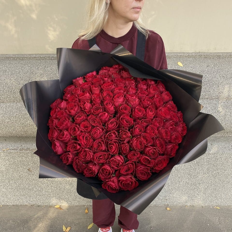 101 красная роза 50 см в черной упаковке