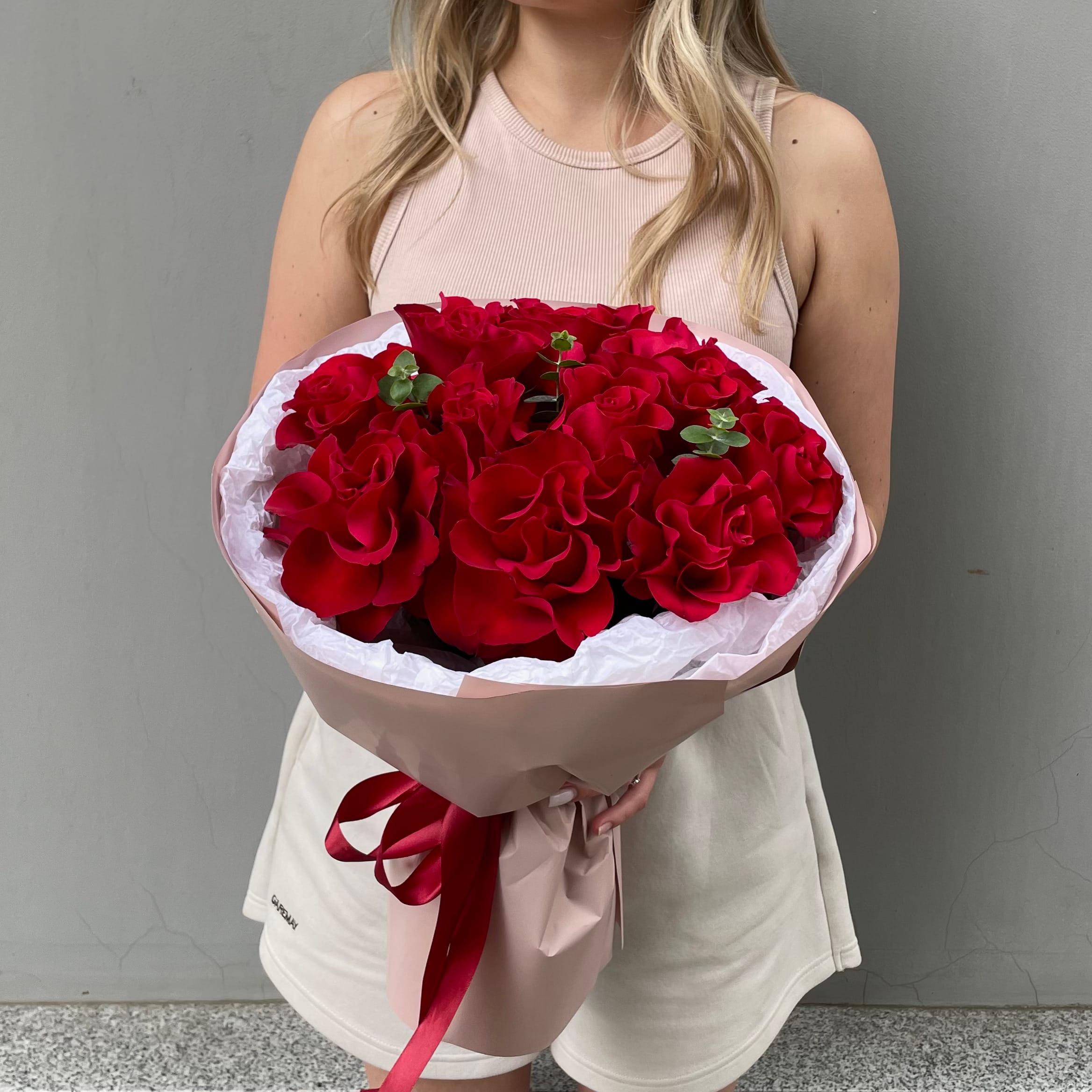 В составе букета 11 французская роза красного цвета. Идеальный букет ко дню всех влюбленных.