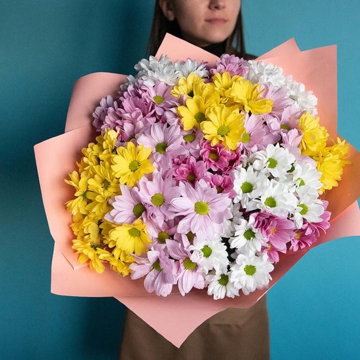 Яркий букет из 15 кустовых хризантем разных оттенков.