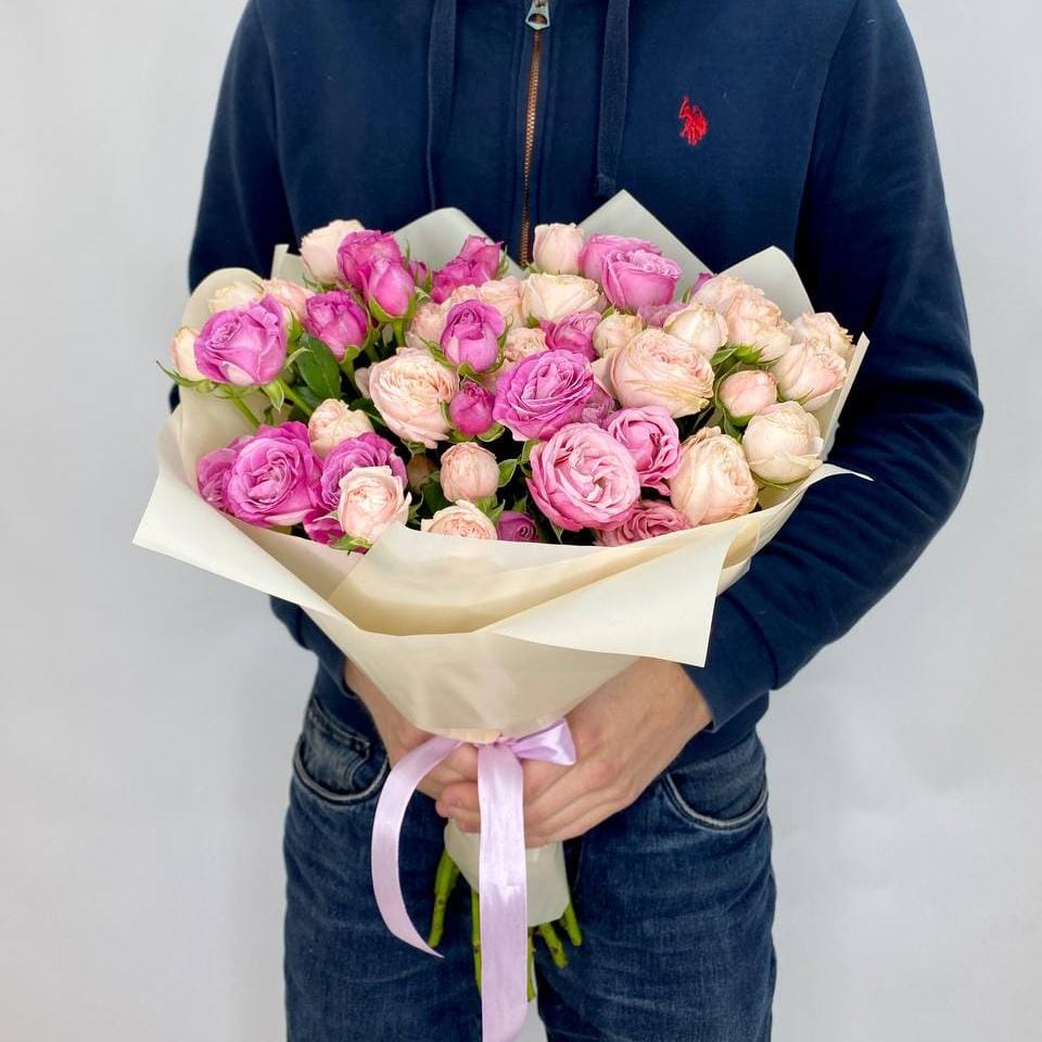 Букет из 15 кустовых роз карамель. Букет собран в нежно-розовых оттенках.