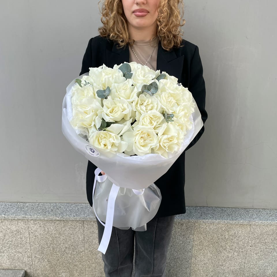 В составе букета 21 французская роза сорта Прауд с эвкалиптом
