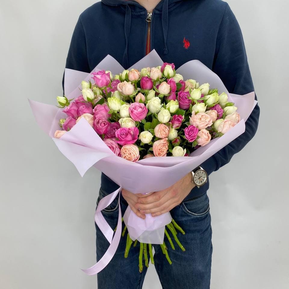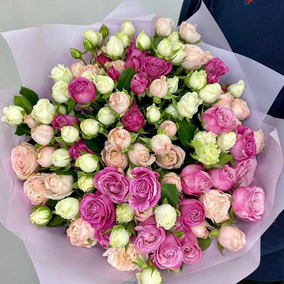 Волшебство природы в каждом кустике. Этот большой букет из 21 кустовой розы микс погружает вас в атмосферу весенней свежести, наполняя жизнь радостью и вдохновением.