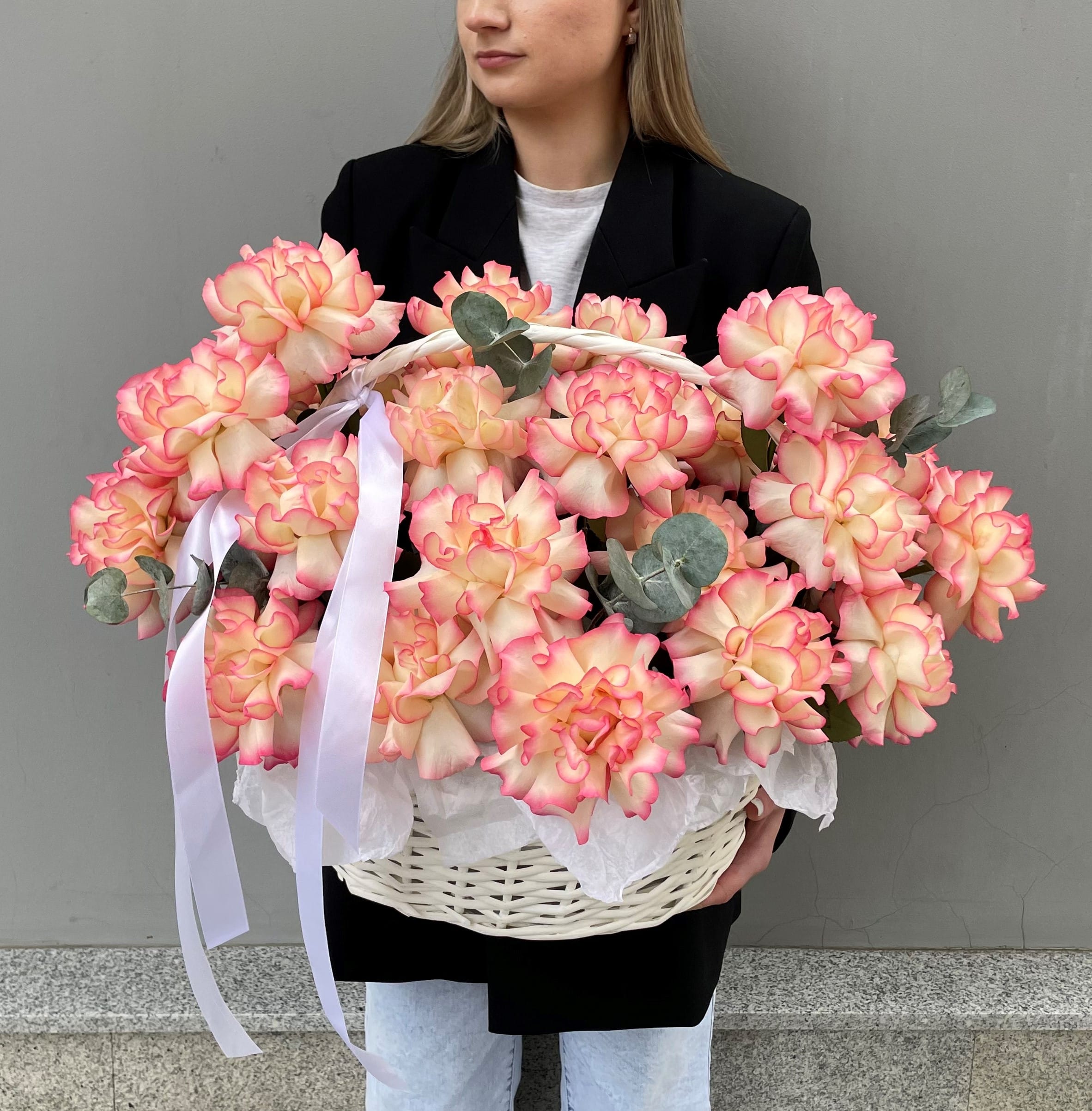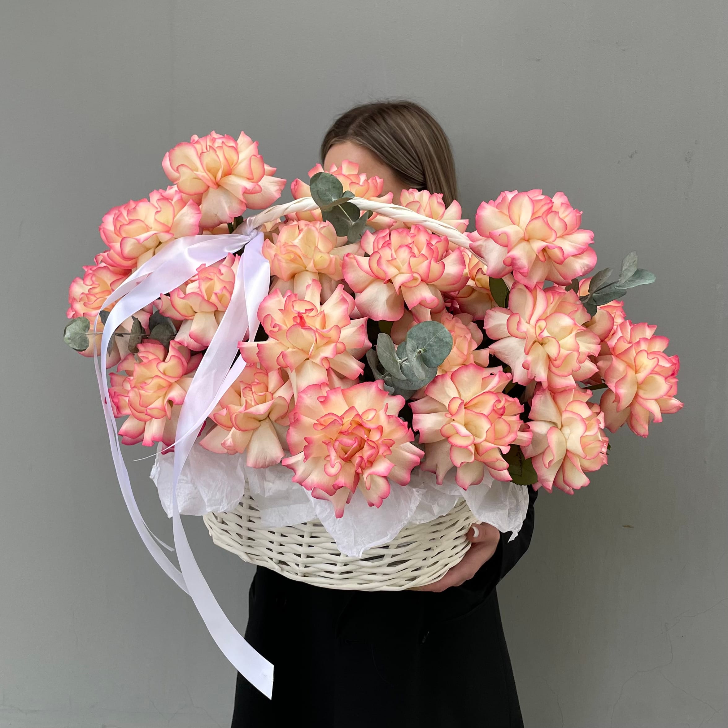 25 нежных французских розочек сорта Джумилия в корзине с добавлением эвкалипта