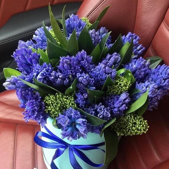 Композиция в шляпной коробке M из 25 синих гиацинтов с зеленью.