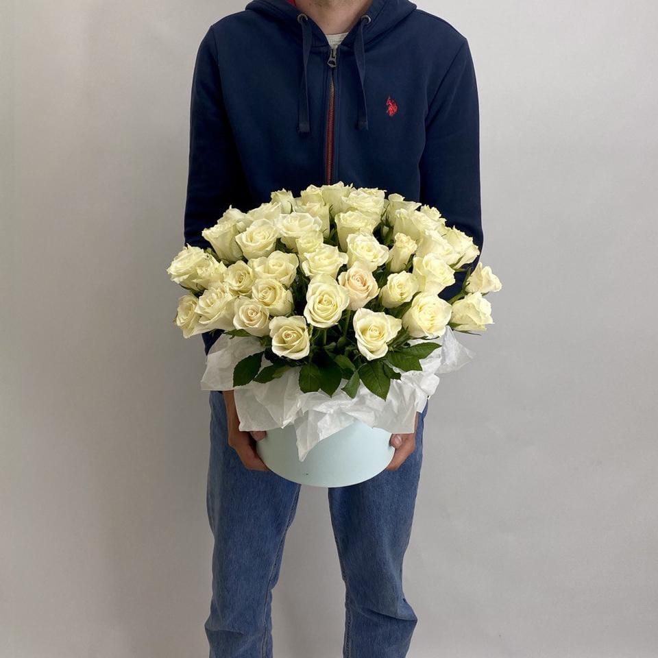 Белоснежные розы в шляпной коробке – это идеальный подарок для особенного случая. 51 белая роза подарит вашему близкому море нежности и восхищения.