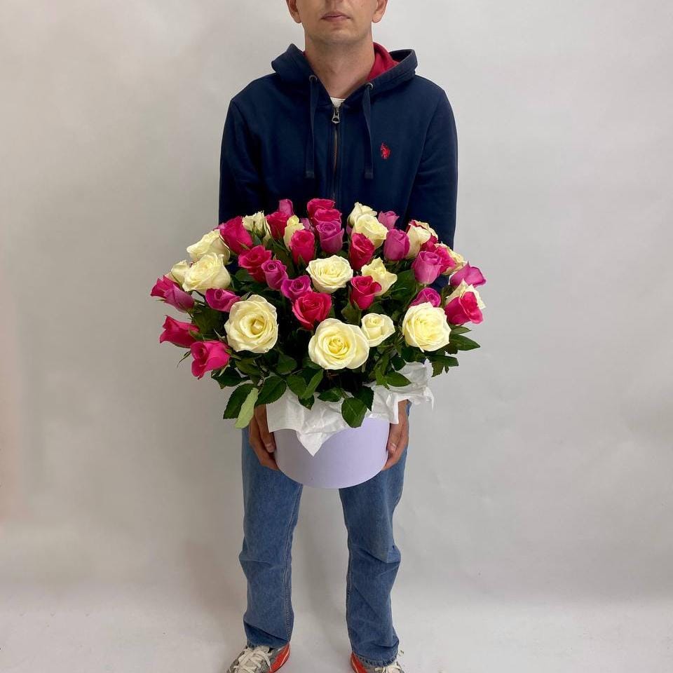 Состав: Роза Кения 40 см (белая, малиновая, розовая) – 51 шт, коробка M
