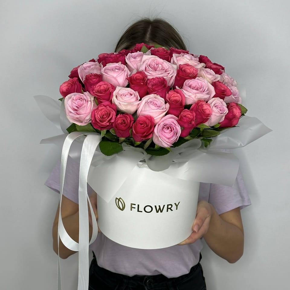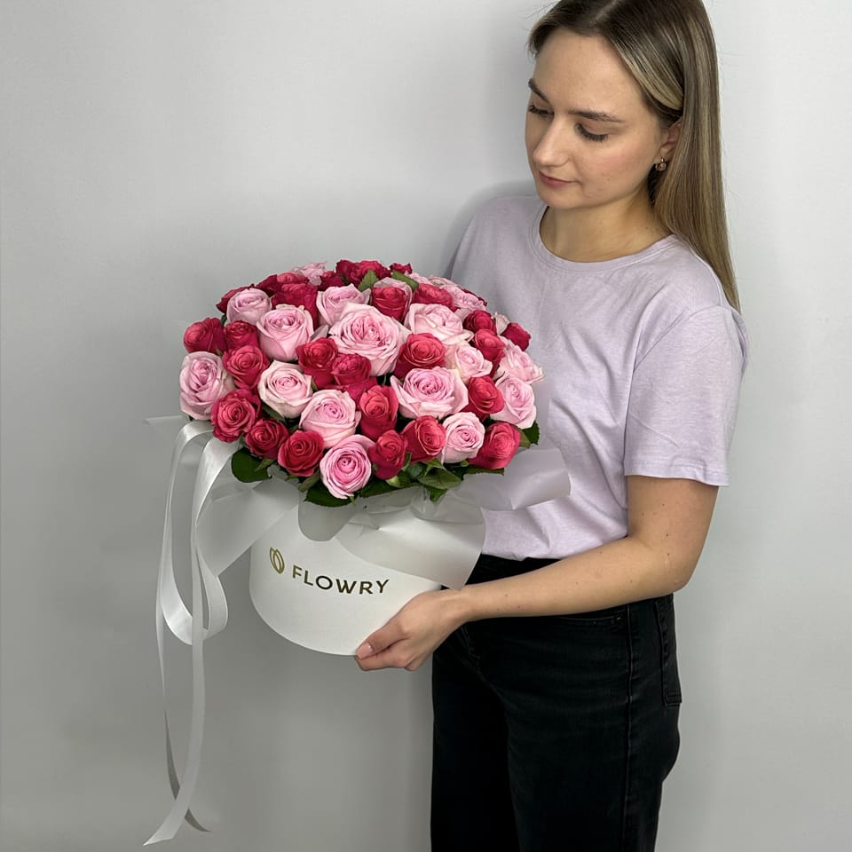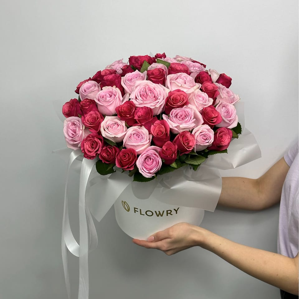 Микс малиновых и розовых роз – 51 шт, Коробка L, лента фирменная
