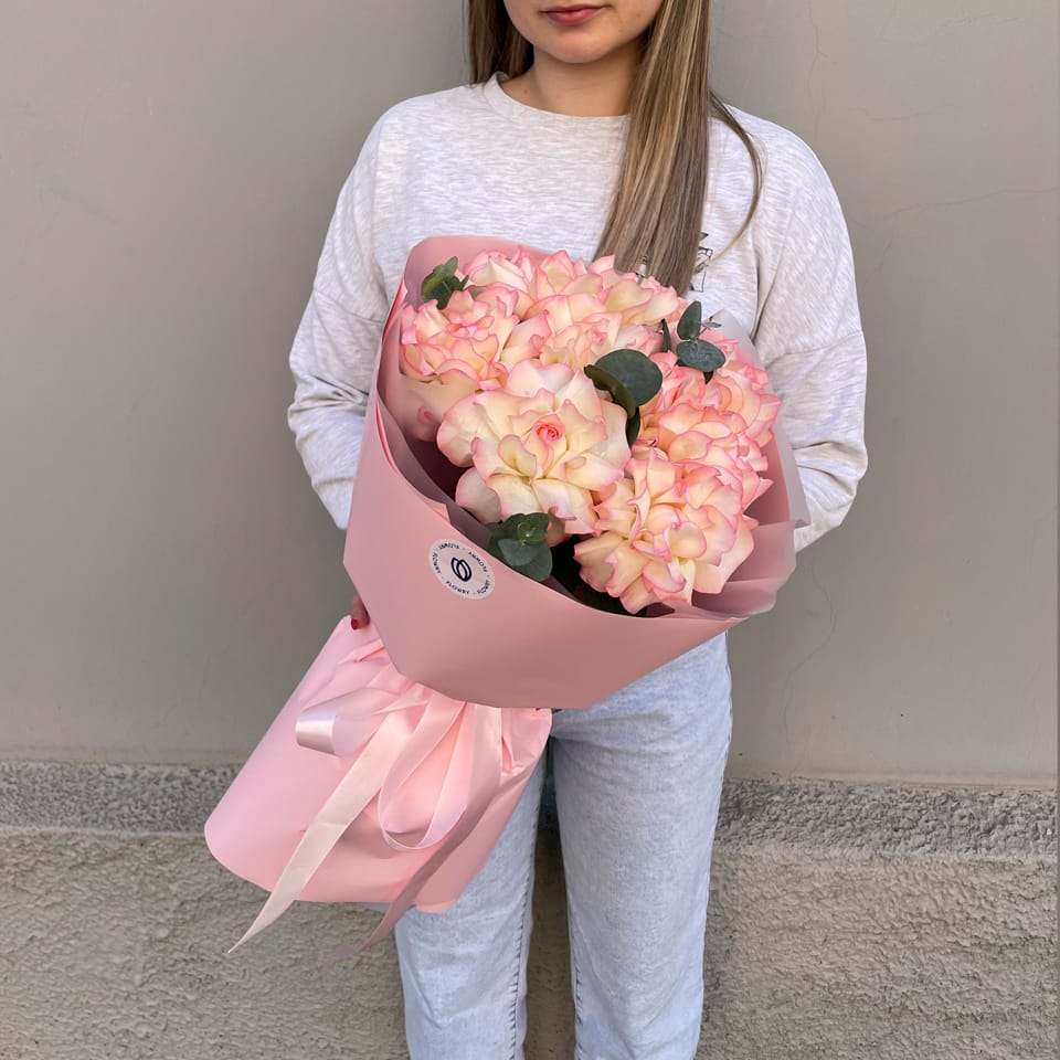 В составе букета 9 французских роз сорта Джумилия с эвкалиптом