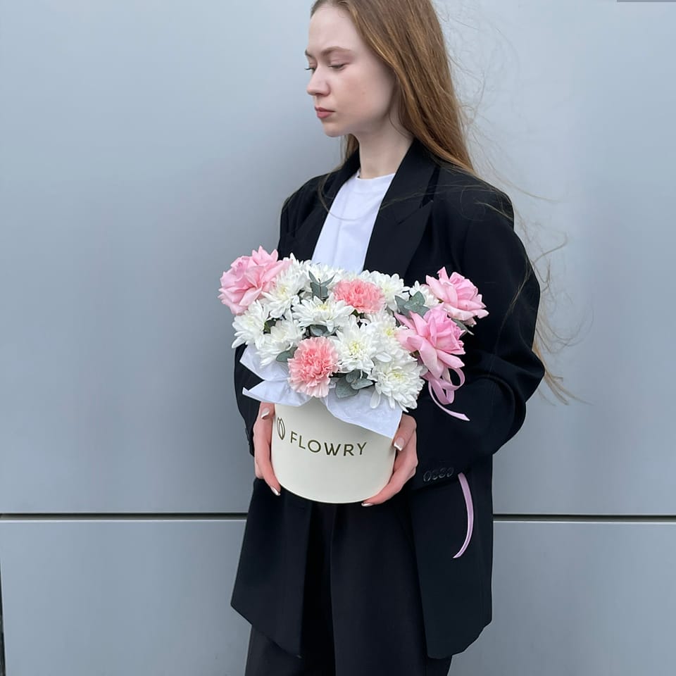 Нежная и стойкая композиция из кустовой хризантемы, диантусов и розовых французский роз