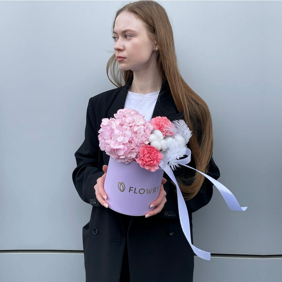 Небольшая авторская композиция с гортензией, диантусами и хлопком.