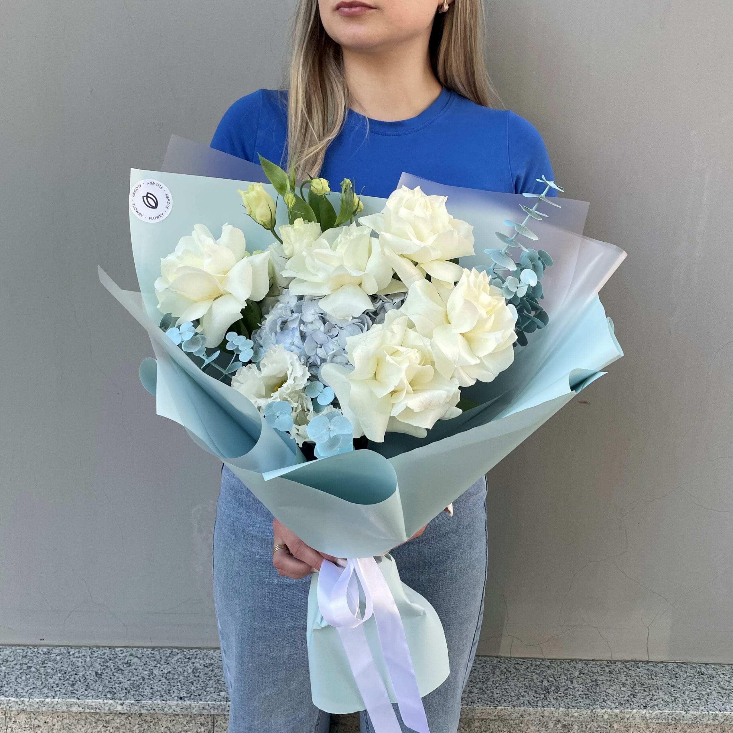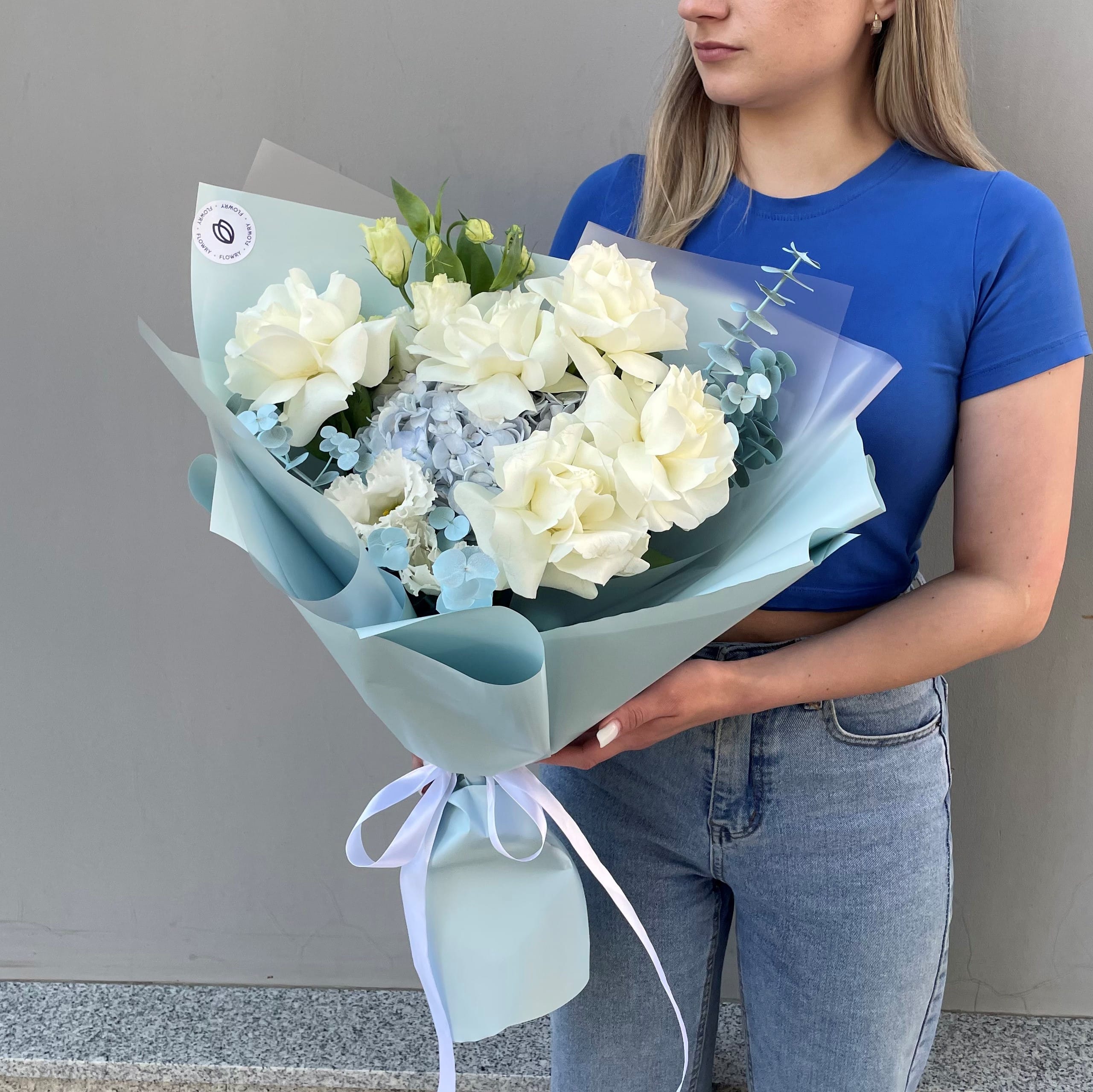 Сборный букет в голубых тонах с использованием воздушных белых французских роз и голубой гортензии