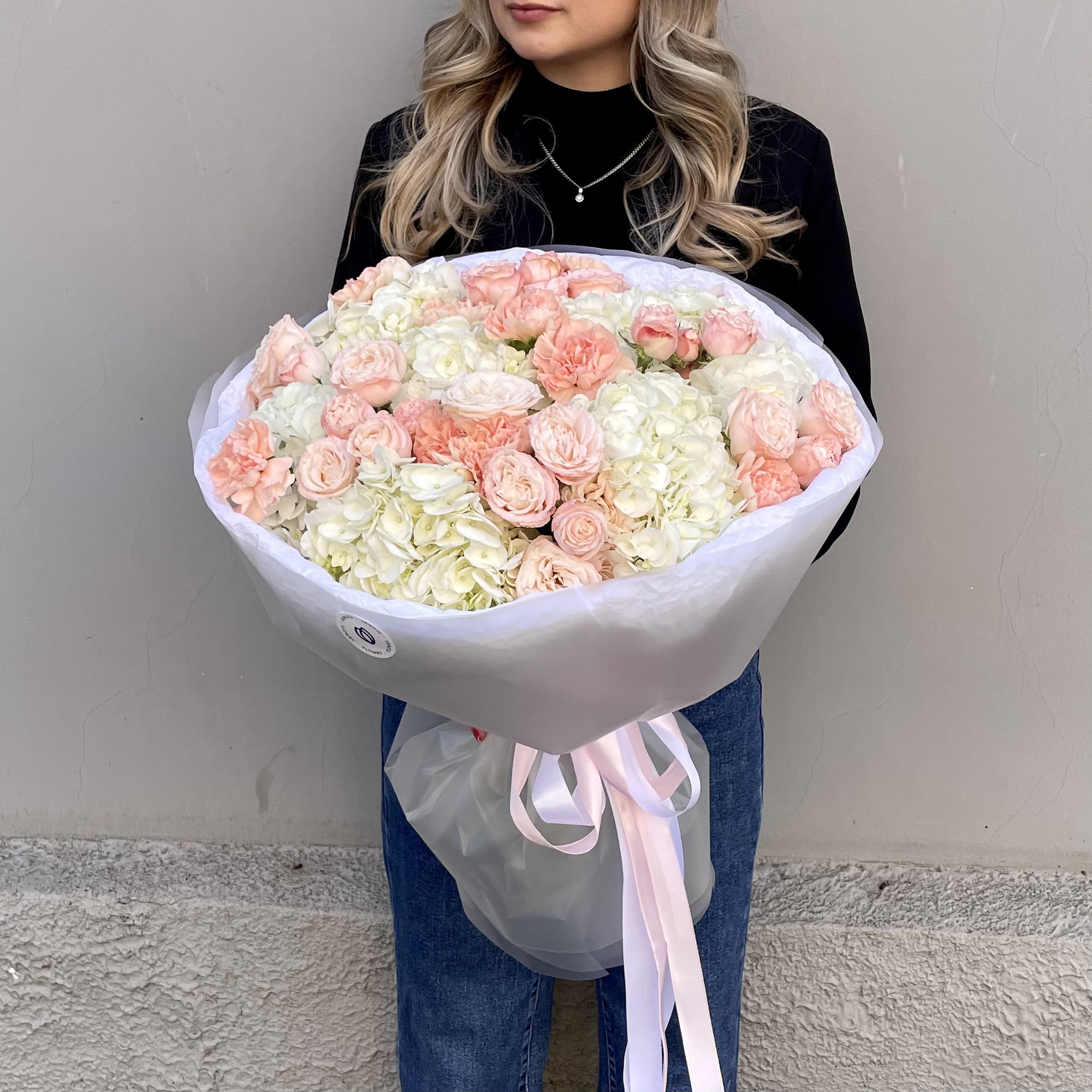 Авторский сборный букет из премиальных белых гортензий в сочетании с пионовидными персиковыми кустовыми розами и диантусами. Нежный букет для особого случая.