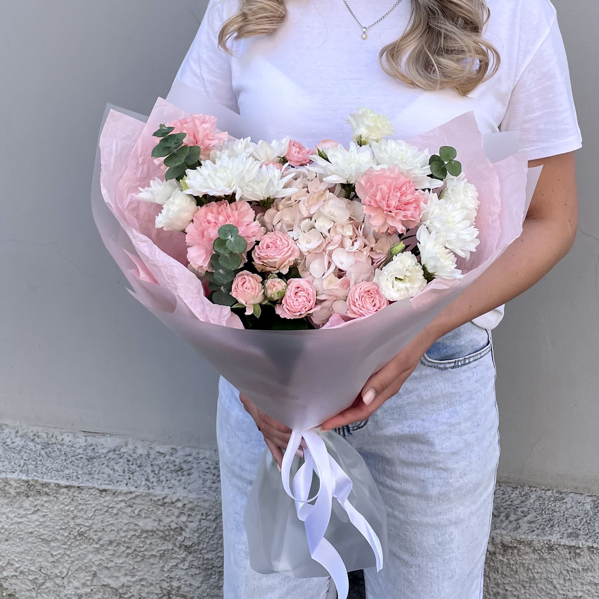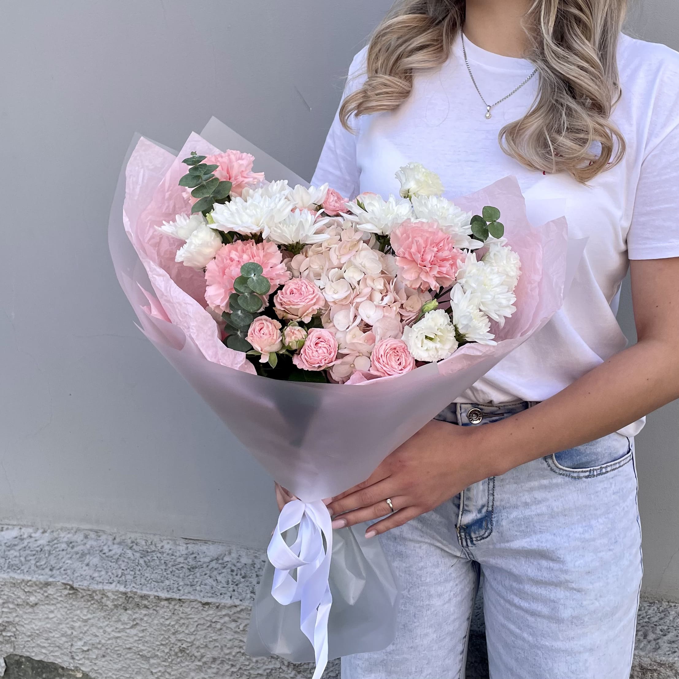 Нежный букет с воздушной гортензией, ароматными диантусами и премиальными пионовидными кустовыми розами для прекрасной принцессы!