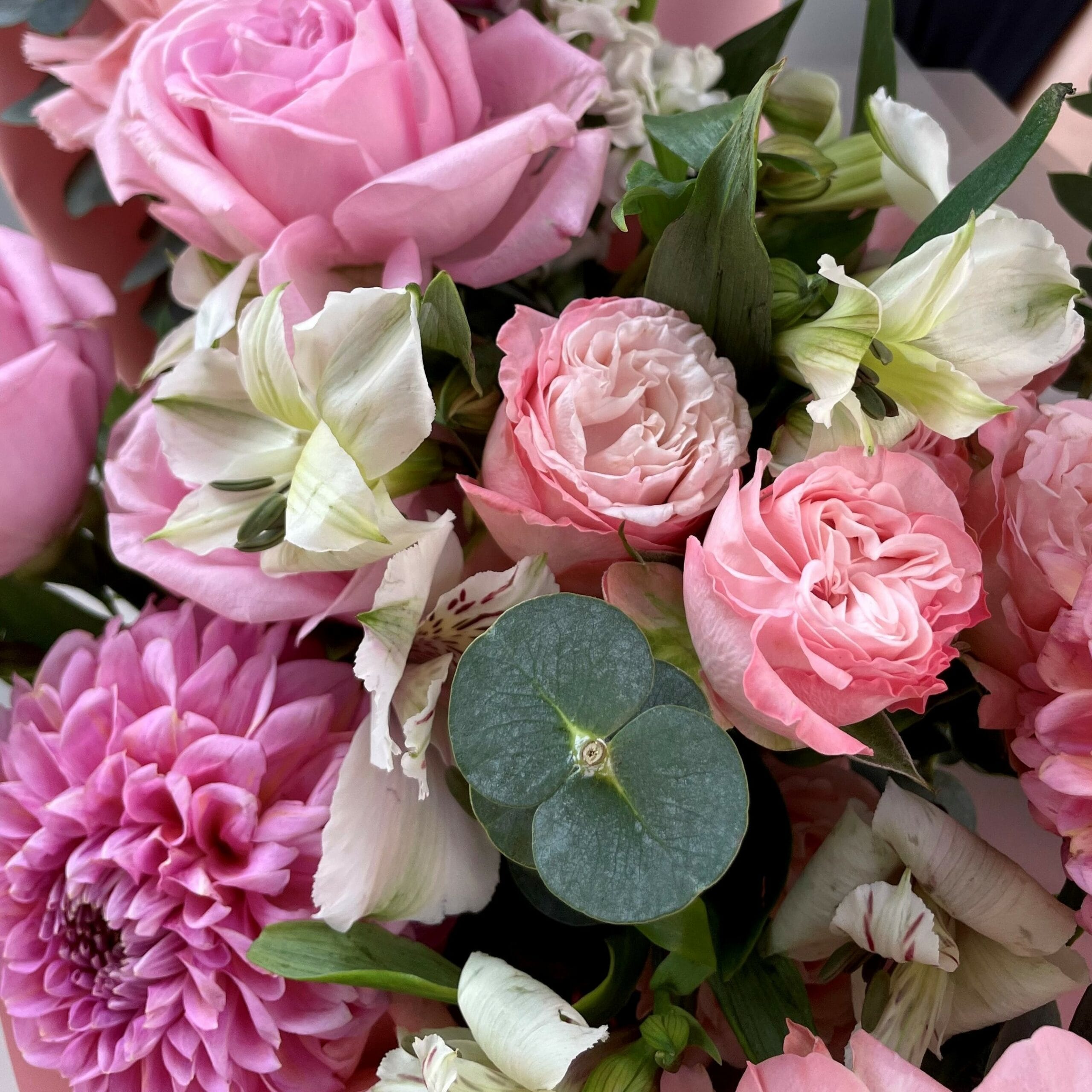 Авторский сборный букетик с георгинами, пионовидными розами и альстромериями