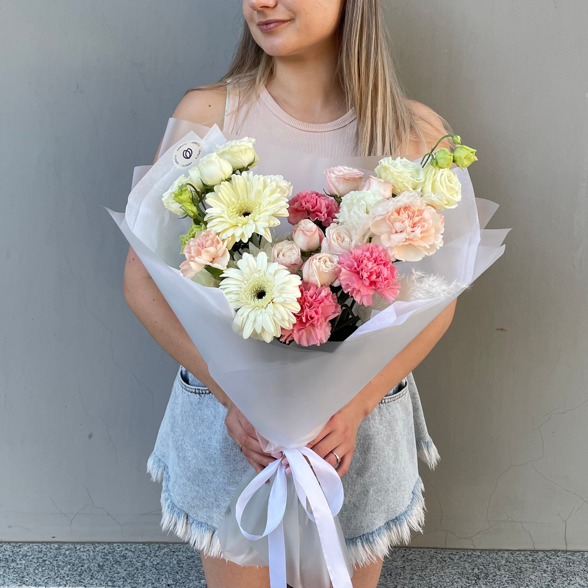 Авторский сборный букет с использованием нежных летних гербер и эустом, а также розовых и персиковых ароматных диантусов.
