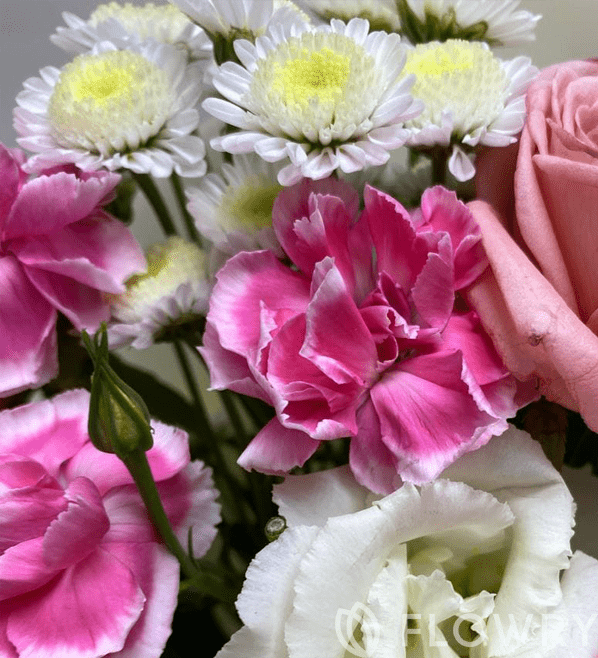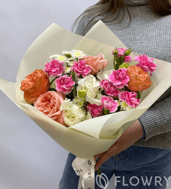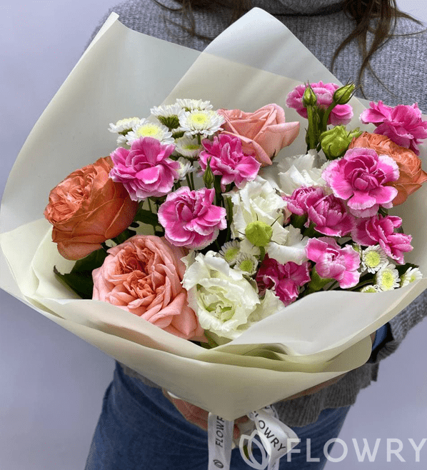 Роза пионовидная, Хризантема кустовая, Гвоздика кустовая, Лизиантус, Пленка корейская, Лента атласная фирменная