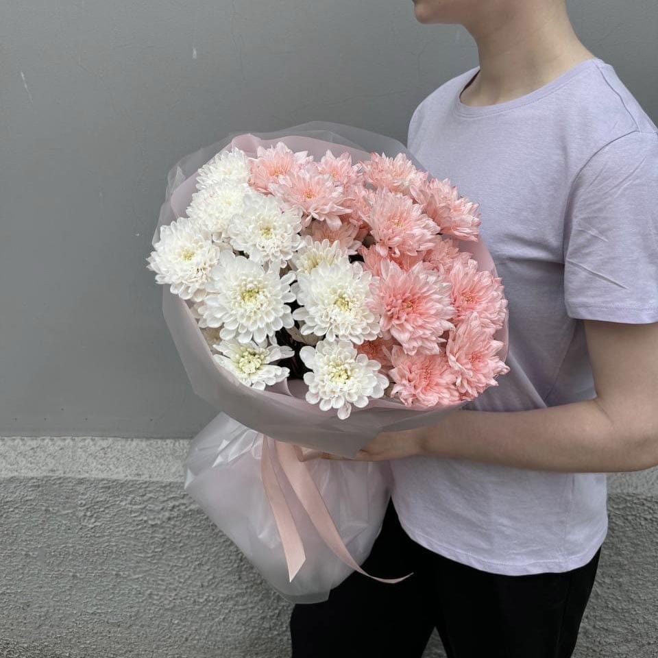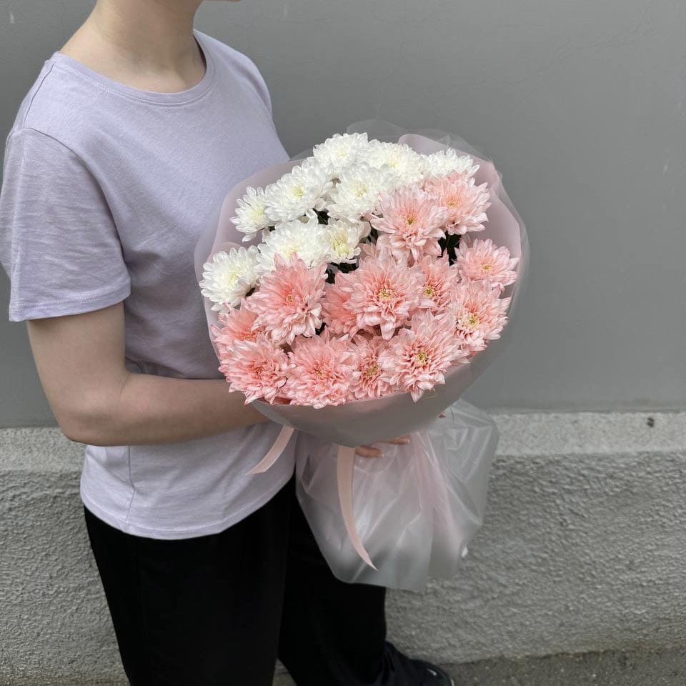 Монобукет из стойкой кустовой хризантемы белого и персикового цвета. Букет будет радовать получателя достаточно долго.