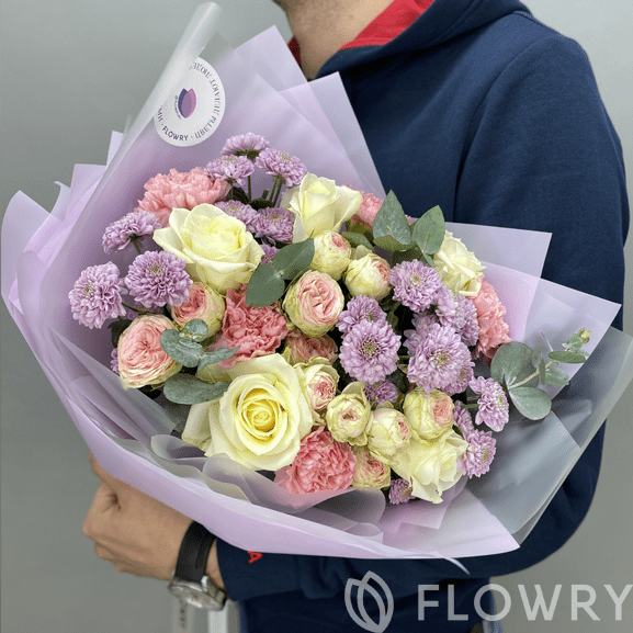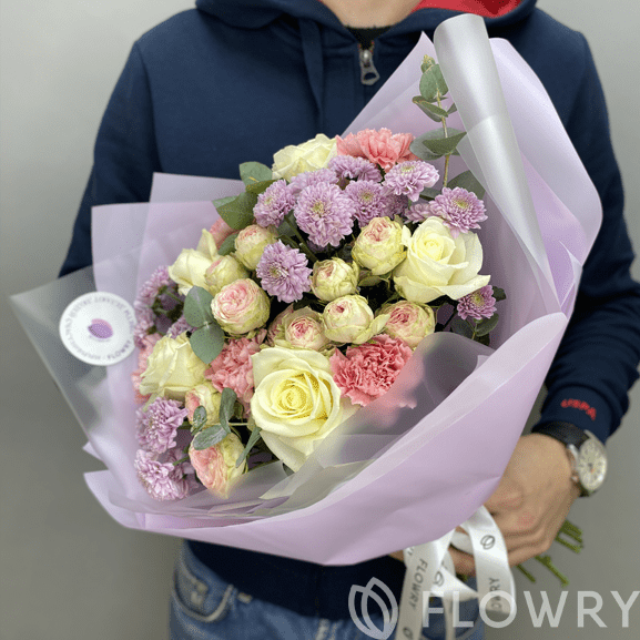 Хризантема кустовая, Роза кустовая пионовидная, Роза одноголовая, Диантус, Эвкалипт, Пленка корейская, Лента атласная фирменная
