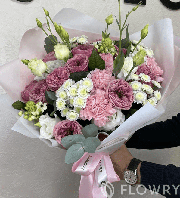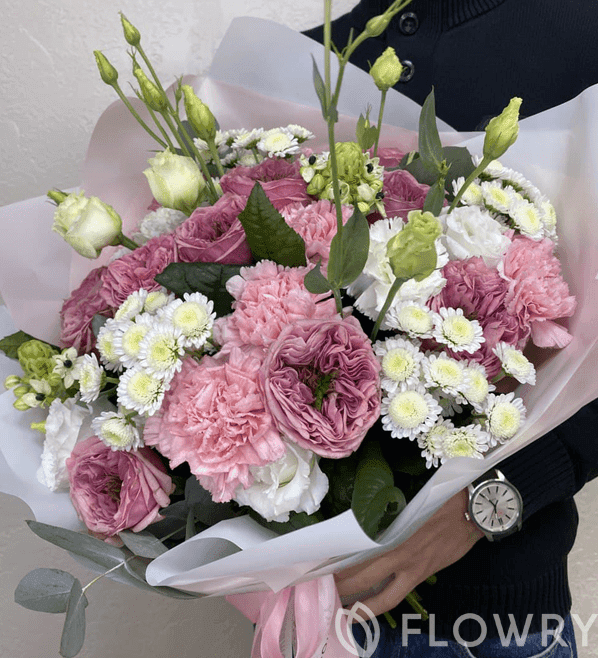 Роза пионовидная, Эустома, Диантус, Гвоздика, Хризантема кустовая, Орнитогалум, Эвкалипт, Пленка корейская, Лента атласная фирменная