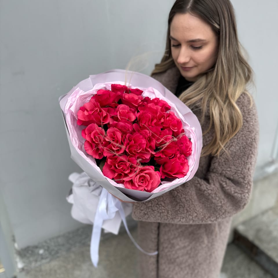 В составе букета 21 французская роза малинового цвета. Идеальный букет ко дню всех влюбленных.