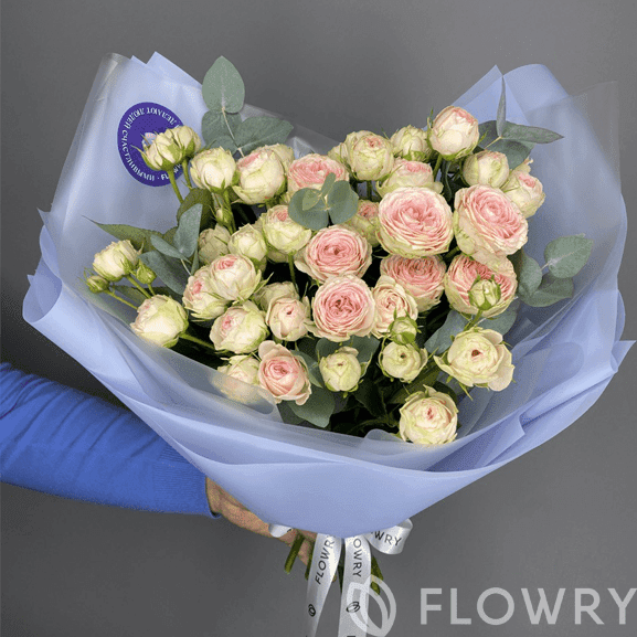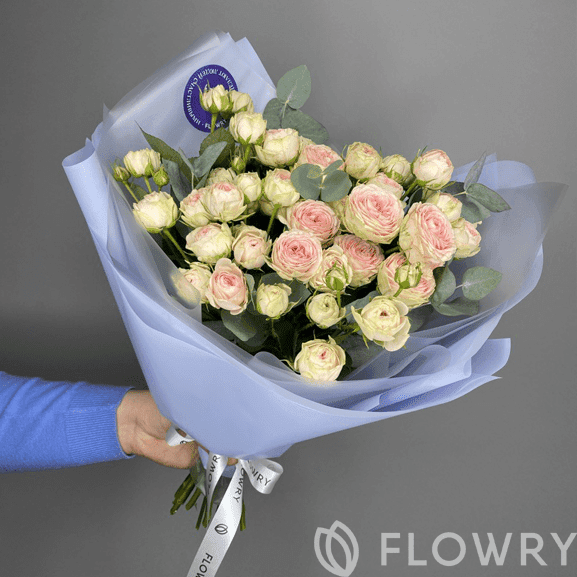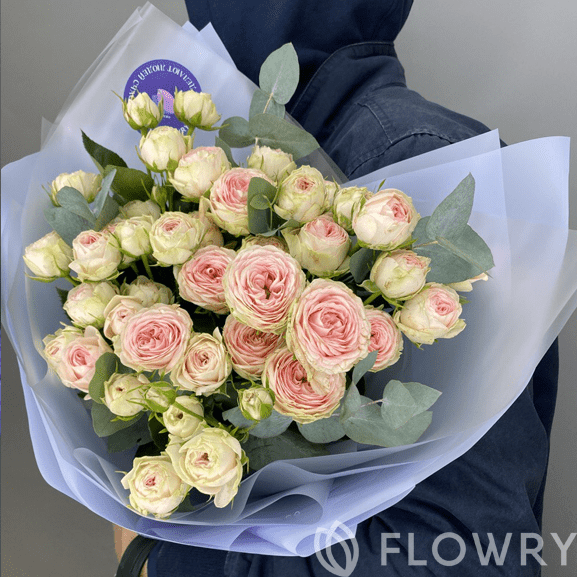 Роза пионовидная кустовая, Эвкалипт, Пленка корейская, Лента атласная фирменная