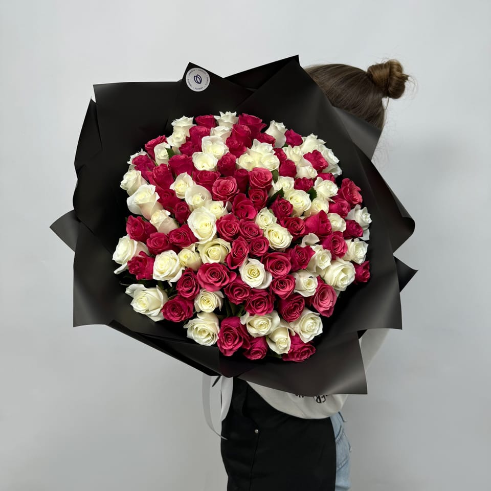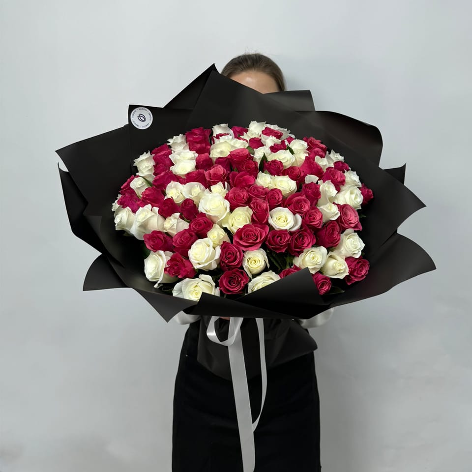 Шикарный букет из 101 белой и малиновой розы в стильной упаковке