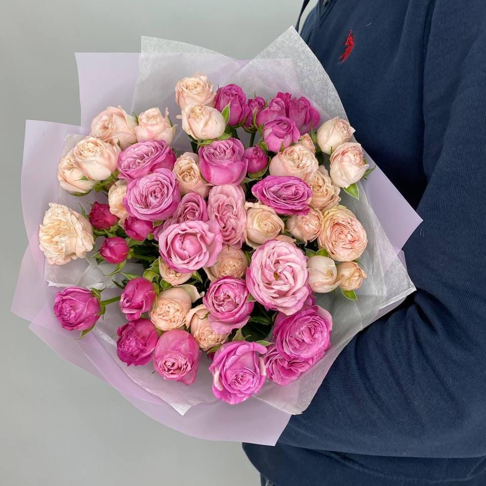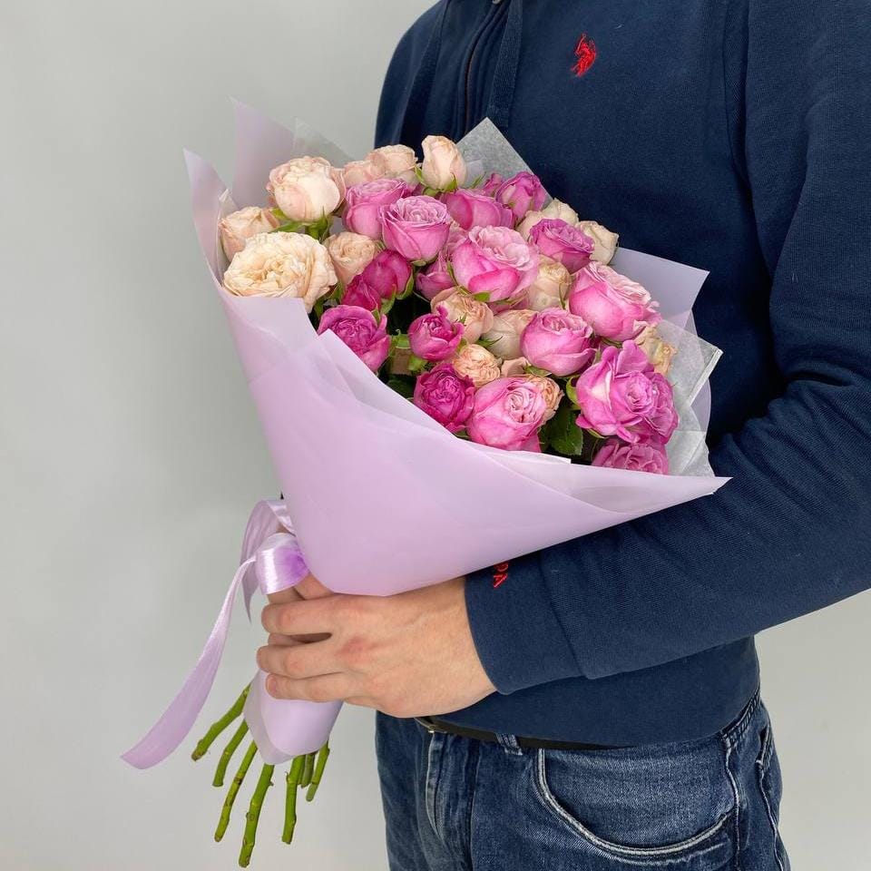 Карамельный букет из 11 кустовой розы 50 см. Букет упакован в стильную матовую пленку.