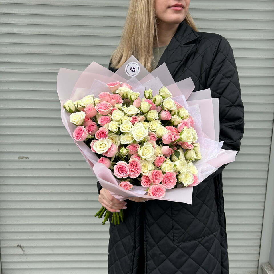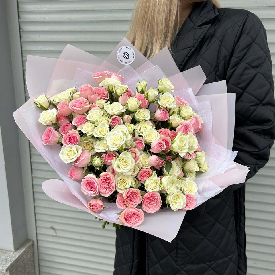 Нежный букет из 21 кустовой розы белого и розового цвета