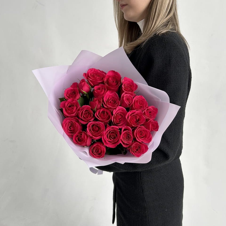 Яркий и стильный букет из 25 малиновых роз – это прекрасный способ выразить свои чувства и эмоции. Нежные цветы подарят массу положительных эмоций и восхищения.