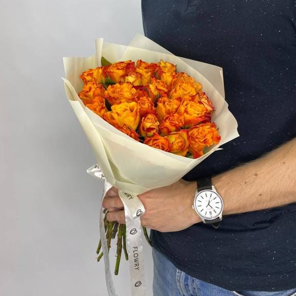 Яркий букет из небольших кенийских роз оранжевого цвета. Несмотря на небольшую высоту розы, девушки очень любят получать букеты из такой розы. Во-первых, букеты очень стойкие и будут долго радовать получателя. Во-вторых, у получателя не возникает проблем с поиском вазы под букет т.к. вазу подобрать под них очень легко.