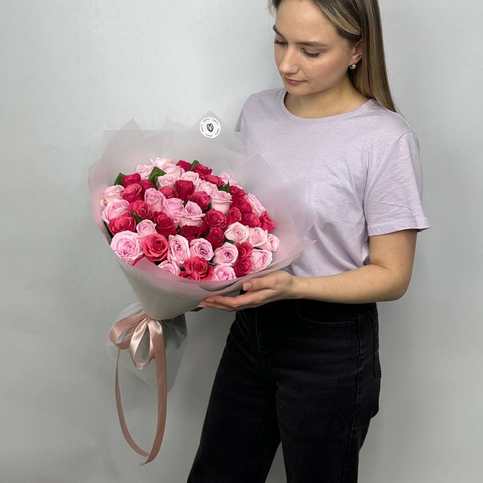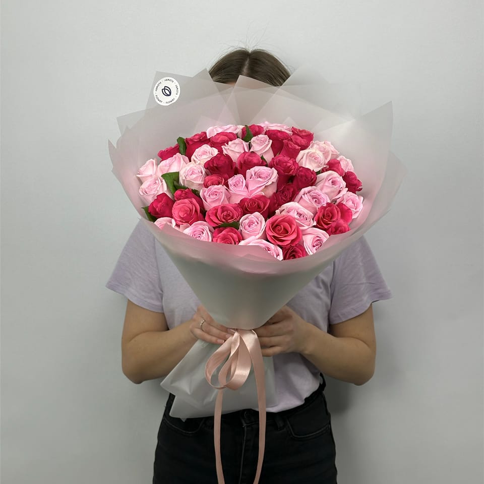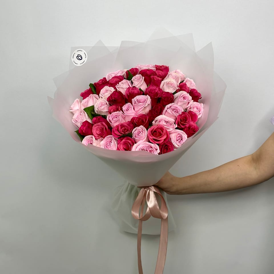 Этот букет – ода романтике и страсти. Насыщенный оттенок малиновых и розовых роз притягивает взгляды и вызывает восторг у всех, кто ценит красоту и элегантность.