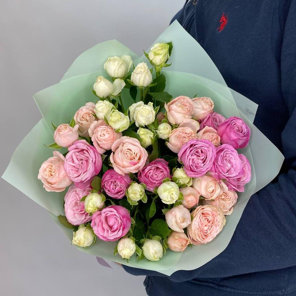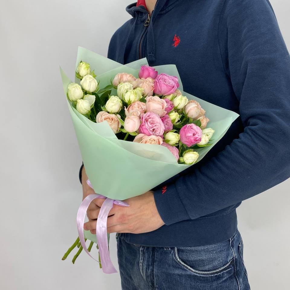 Небольшой букет из стойкой кустовой розы. Букет собран из роз разных оттенков, что делает букет ярким и очень интересным. В составе 7 кустовых роз микс в фирменной матовой пленке.