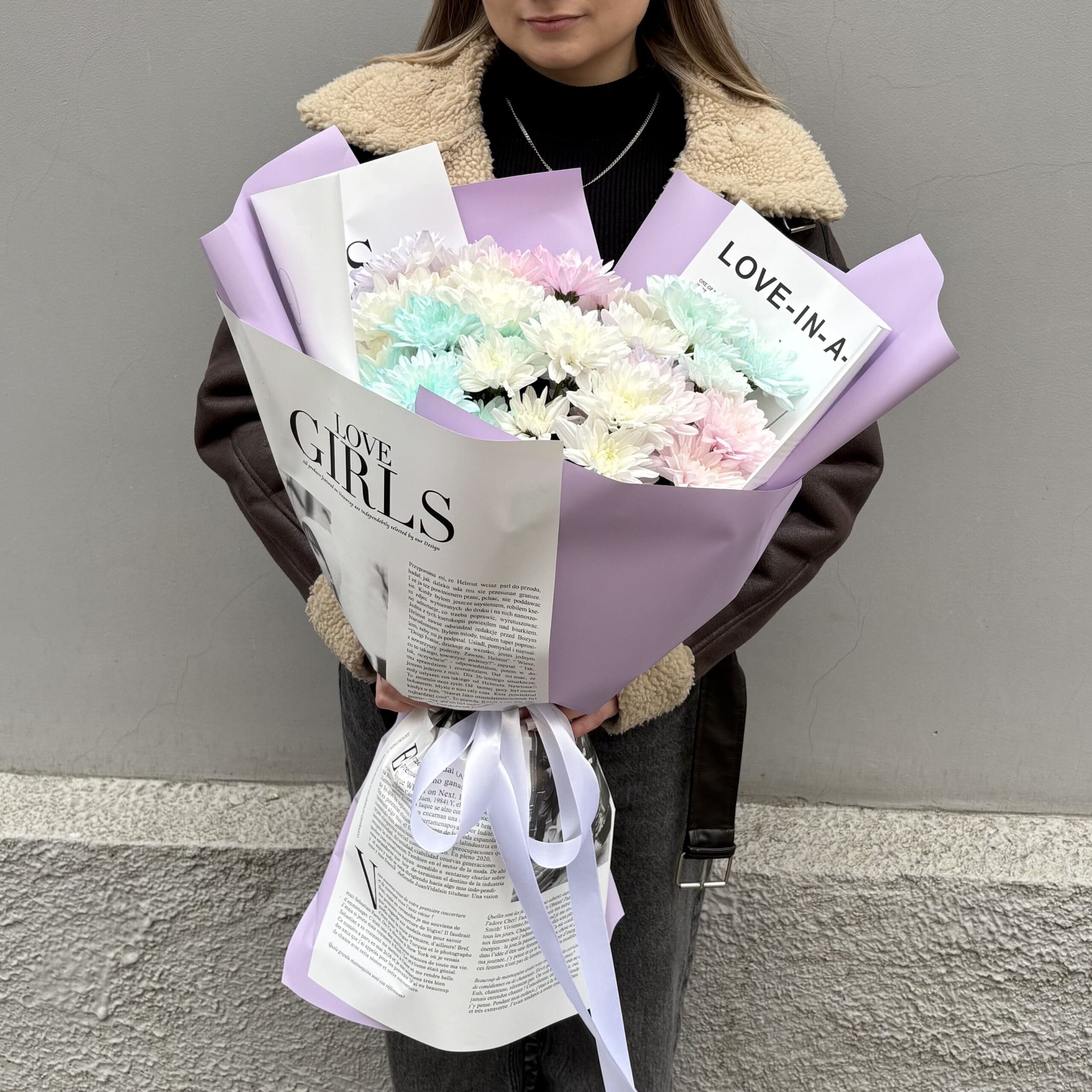 Монобукет из пушистых кустовых хризантем в пастельных оттенках