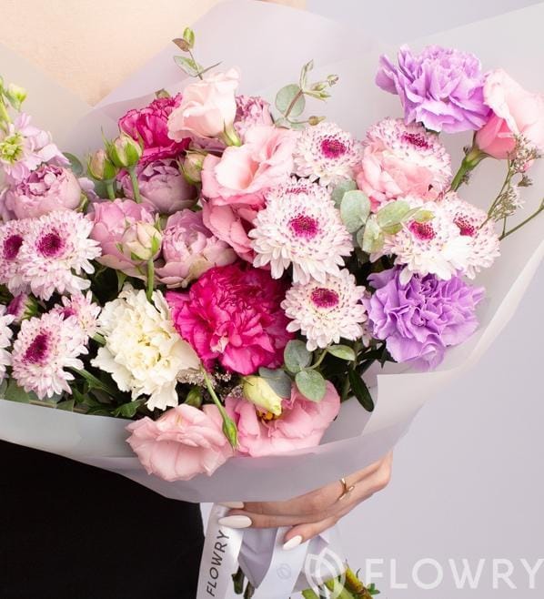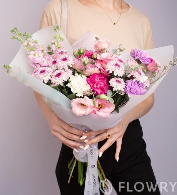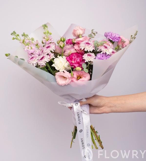 Эустома, Диантус, Матиолла, Хризантема кустовая, Эвкалипт пленка корейка, лента атласная фирменная