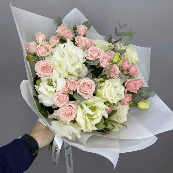 Роза кустовая, Эустома, Эвкалипт, фирменная упаковка