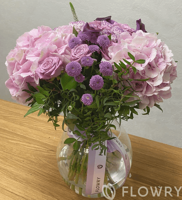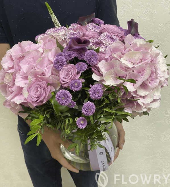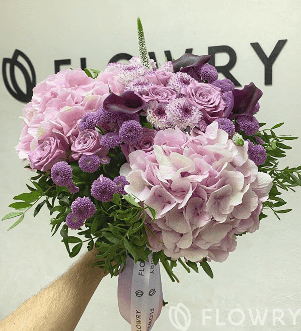 Гортензия, Роза Маритим, Вероника, Хризантема кустовая, Фисташка, Каллы, лента фирменная