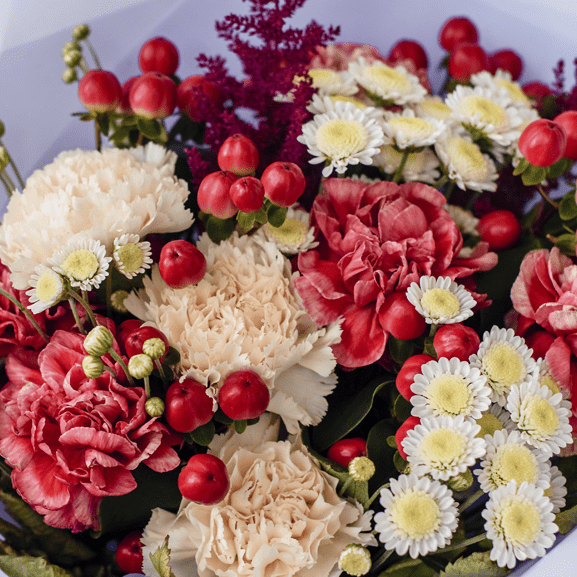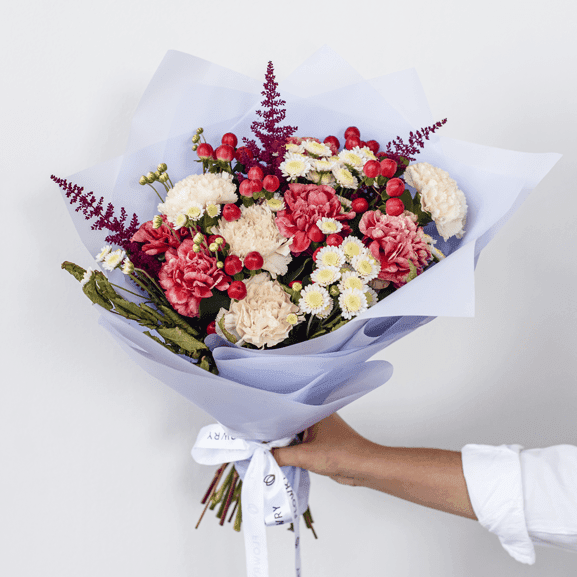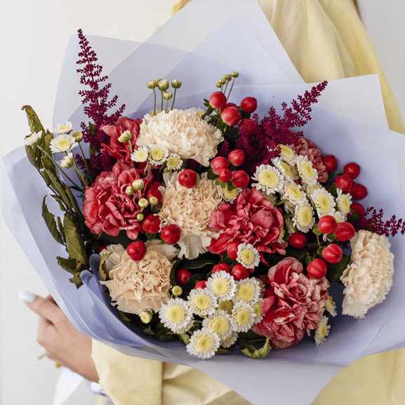 Диантус, Гвоздика, Астильба, Гиперикум, Пленка корейская, Лента атласная фирменная