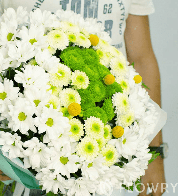Хризантема кустовая, Краспедия, Папоротник, Лента атласная фирменная, Пленка корейская