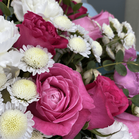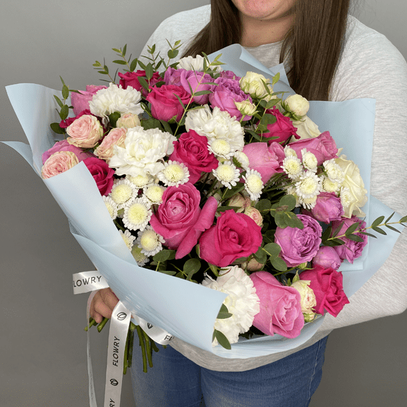 Кустовая роза “Мисти баблс”, Одноголовые розы, Хризантема кустовая, Эвкалипт, Роза кустовая.