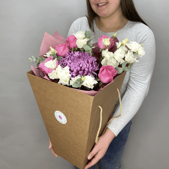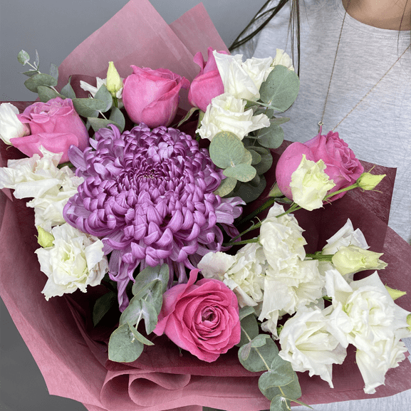 Хризантема одноголовая, Роза Люпин, Эустома, Эвкалипт, фирменное оформление