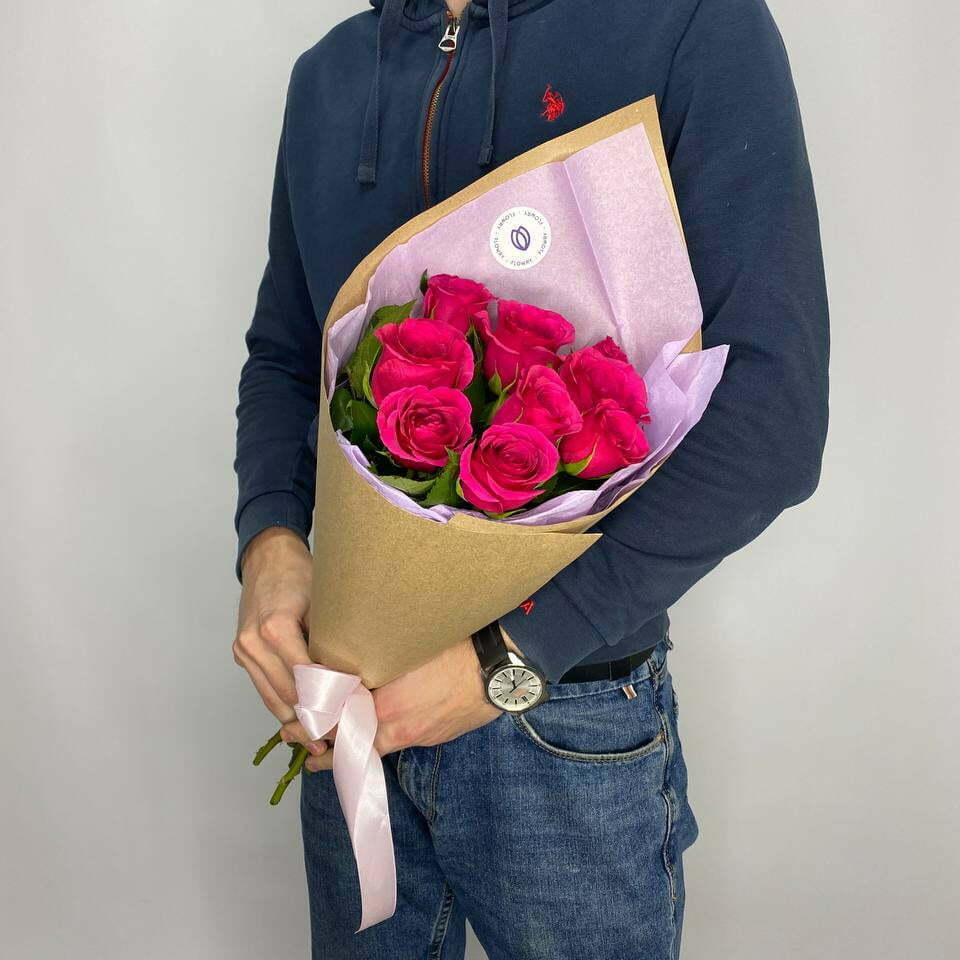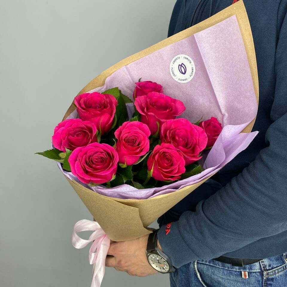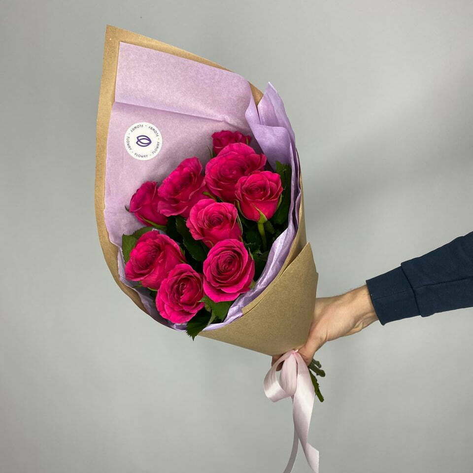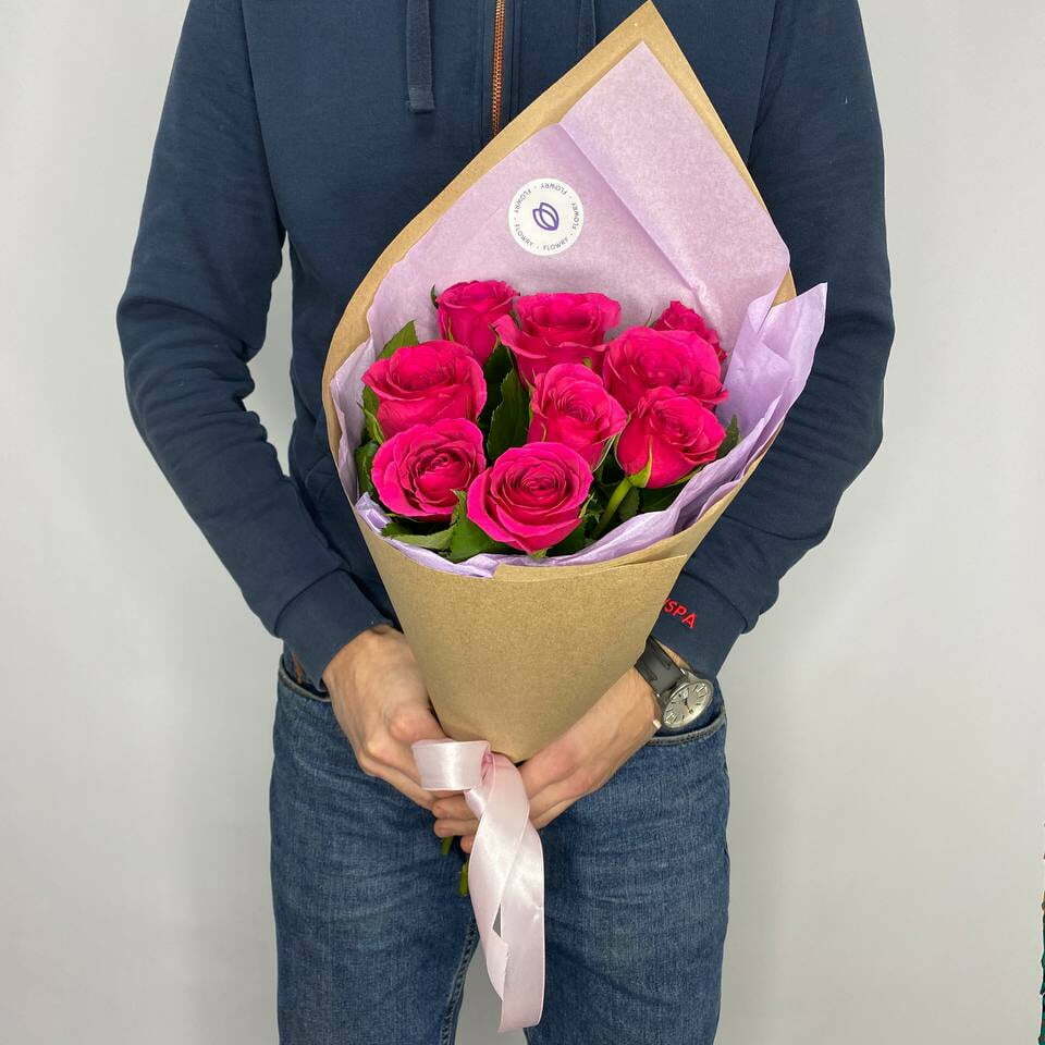 Небольшой букет-комплимент из 9 роз малинового цвета 40 см.
