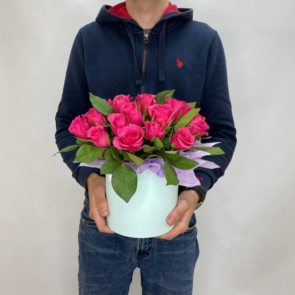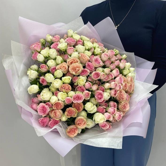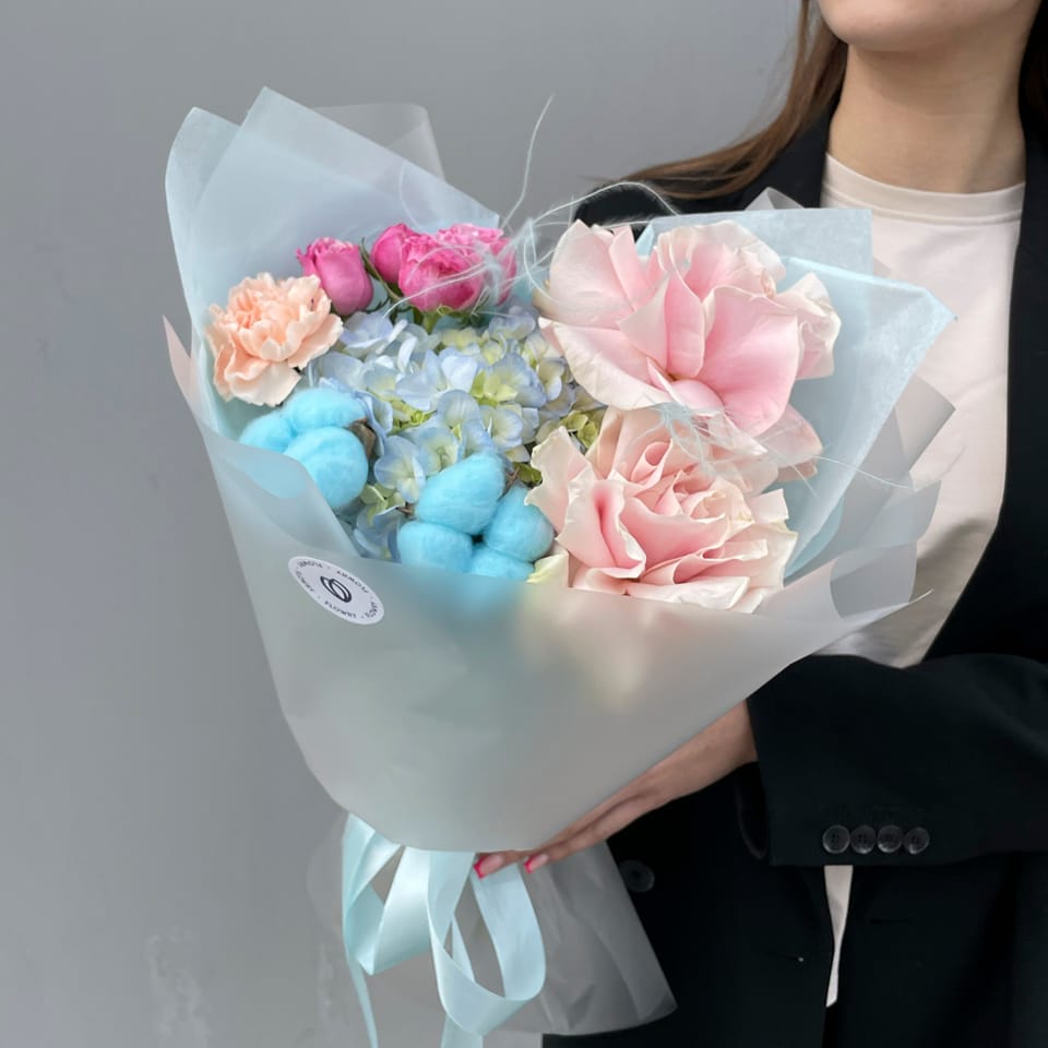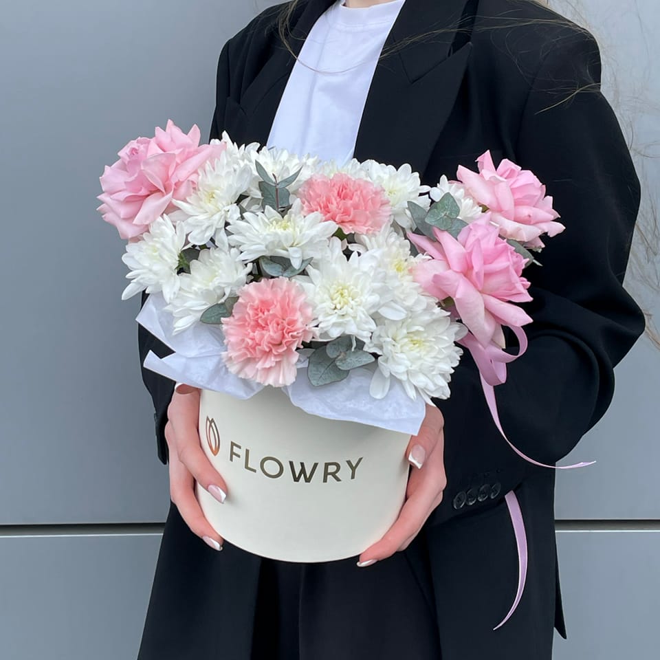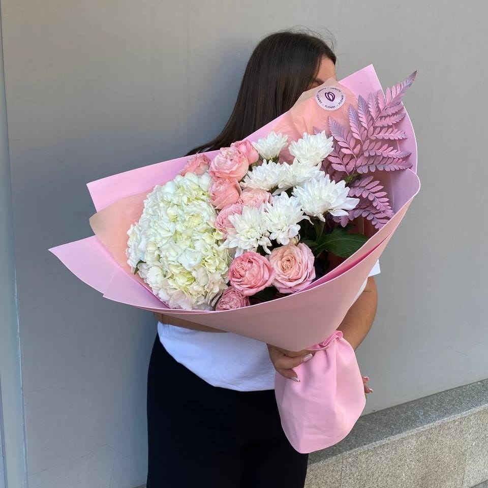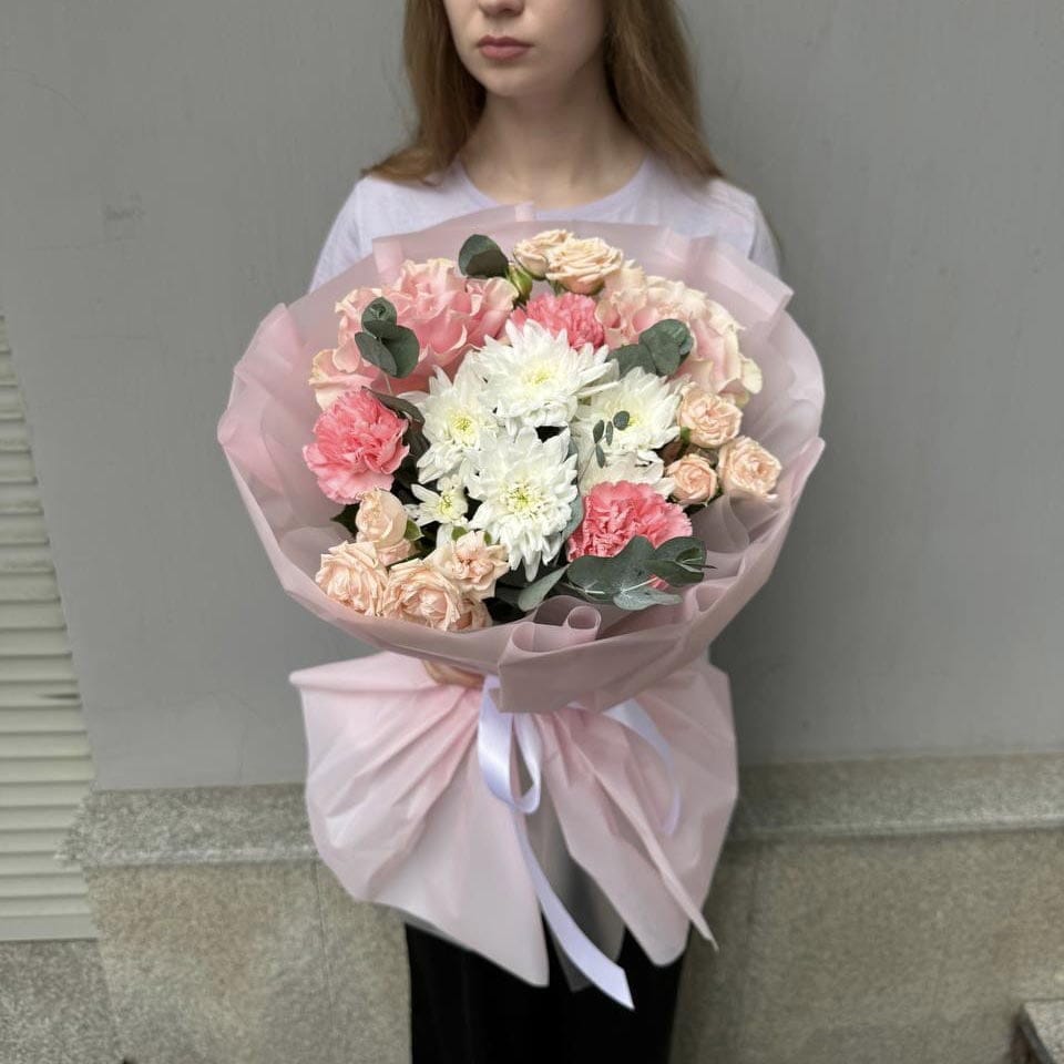 Небольшой букет из нежных диантусов розового цвета и одноголовых роз.