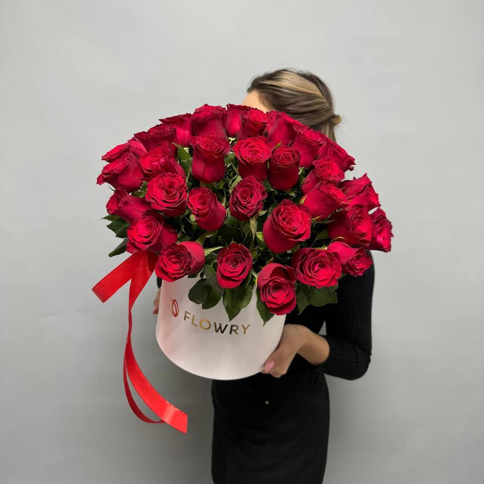Красная роза – 51 шт, Коробка L, лента фирменная