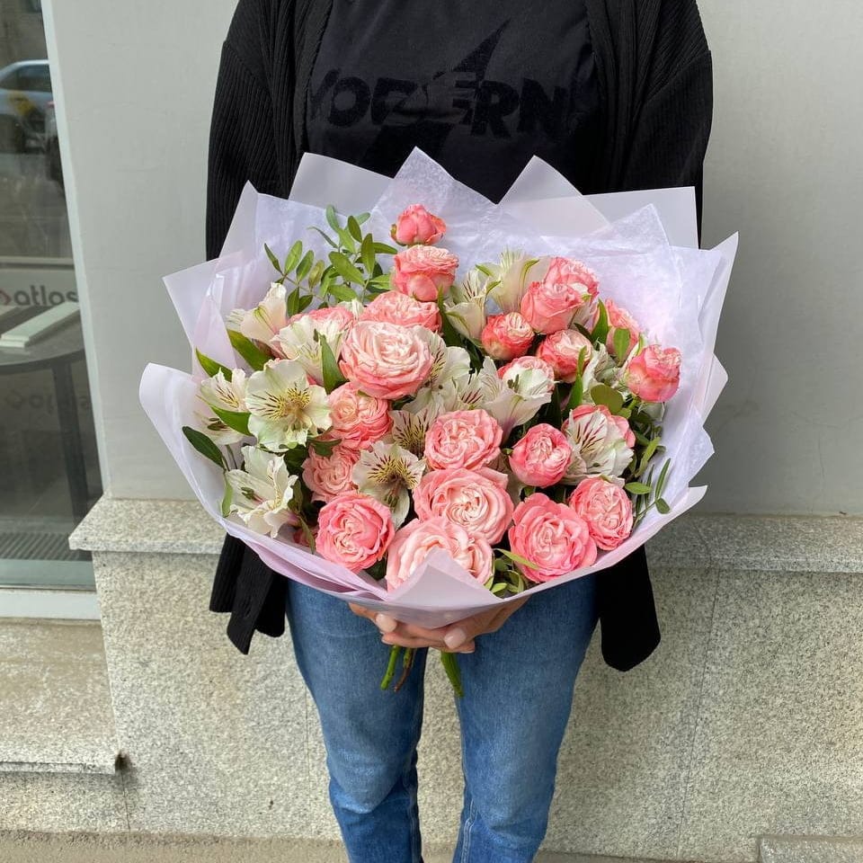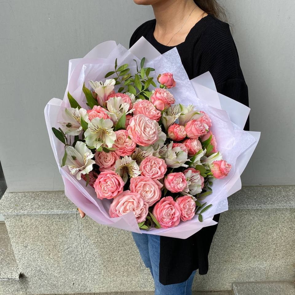 Букет из кустовых пионовидных роз и альстромерий
