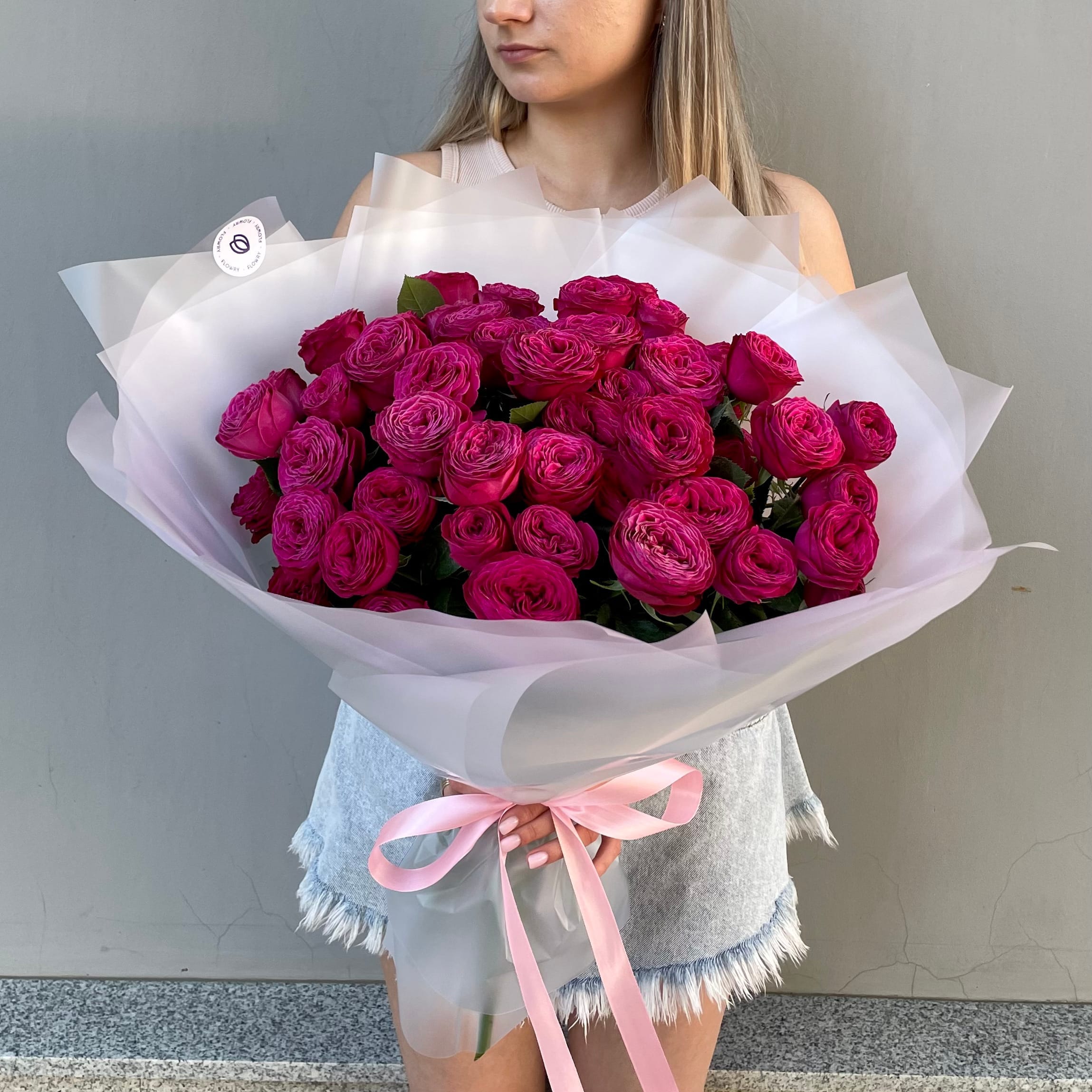 Монобукет из кустовых пионовидных роз Premium в ярком малиновом оттенке.