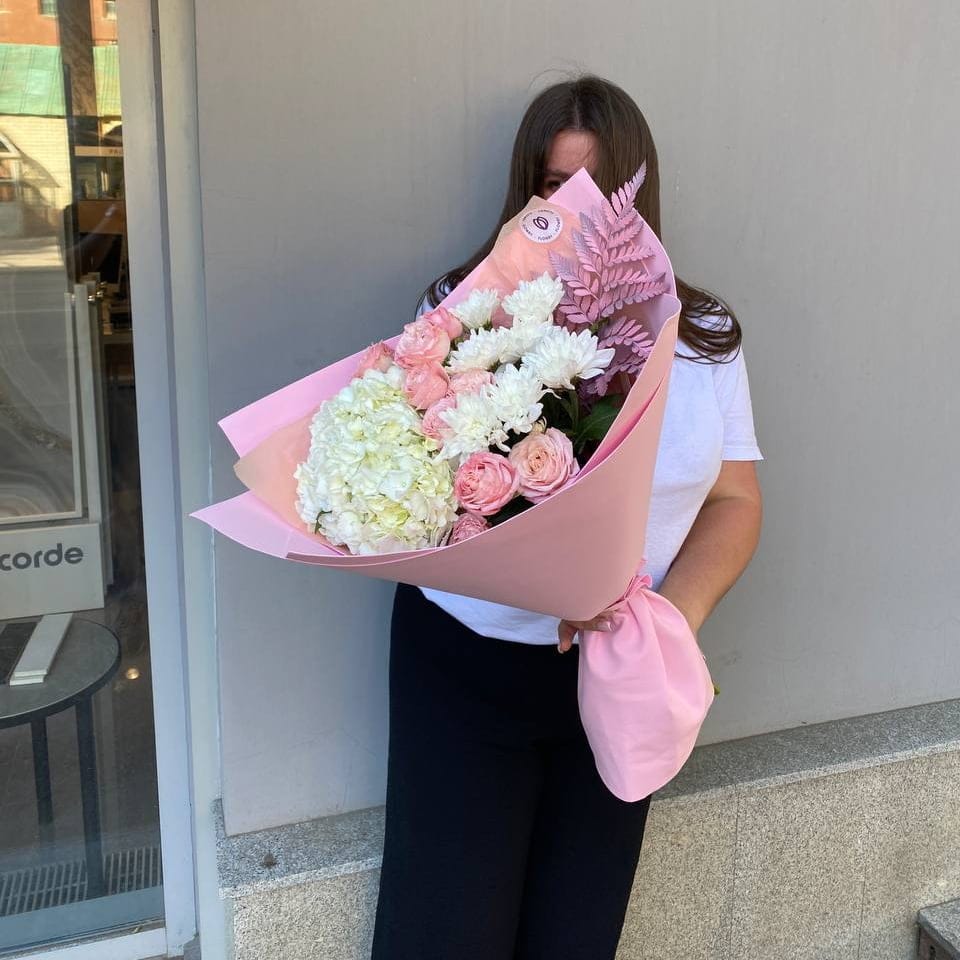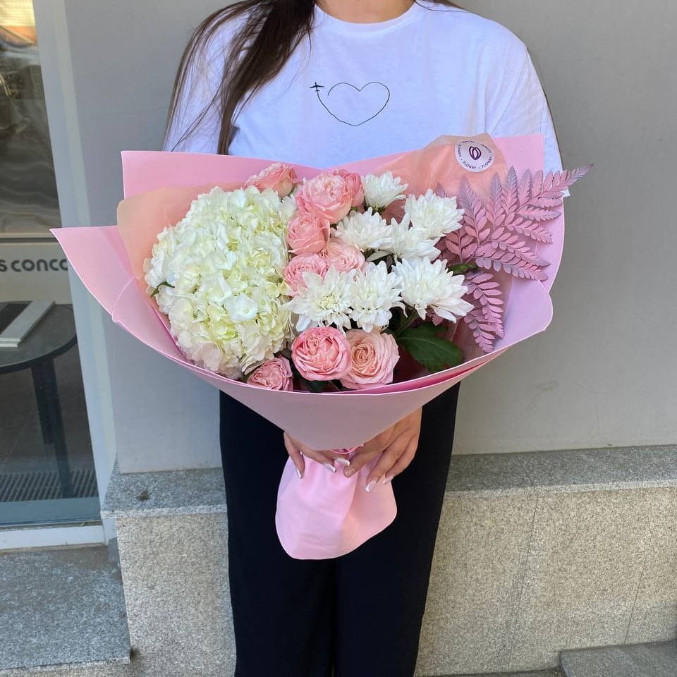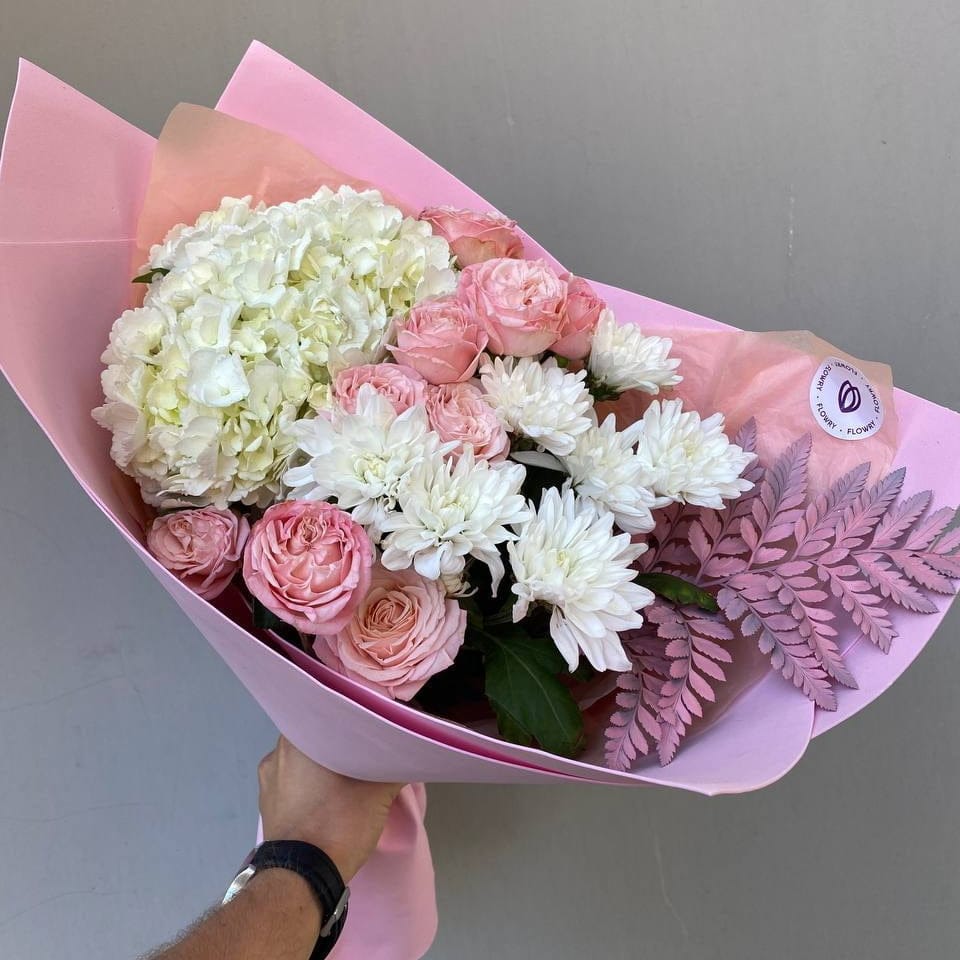 Авторский букет №22 – это сочетание изысканных цветов, которое призвано порадовать и восхитить своей красотой. В этом букете великолепно сочетаются изящная хризантема, нежные розовые кустовые розы, воздушные гортензии и изящный папоротник. Каждый элемент этого букета выражает нежность и элегантность, создавая атмосферу умиротворения и восхищения. Подарите этот букет своему любимому человеку, чтобы подчеркнуть его особенность и уникальность.