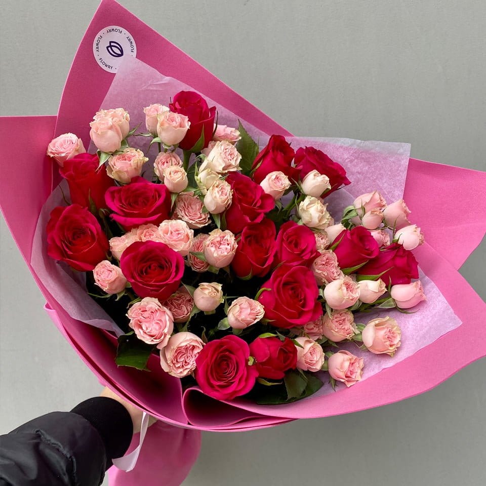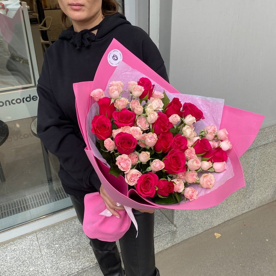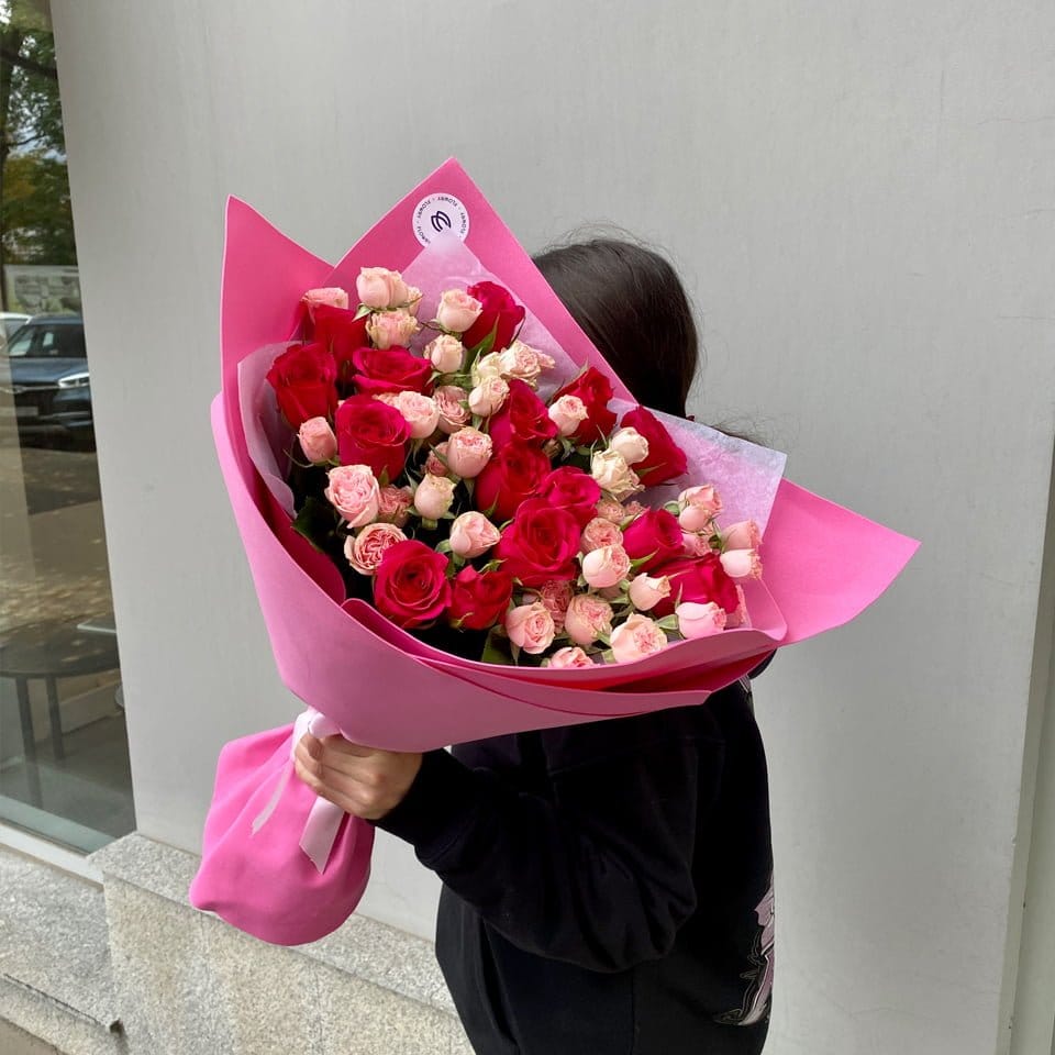 Сборный букет из нежно-розовых кустовых роз и одноголовых роз малинового цвета. Букет будет радовать получателя своей стойкостью.
