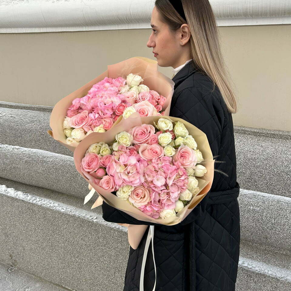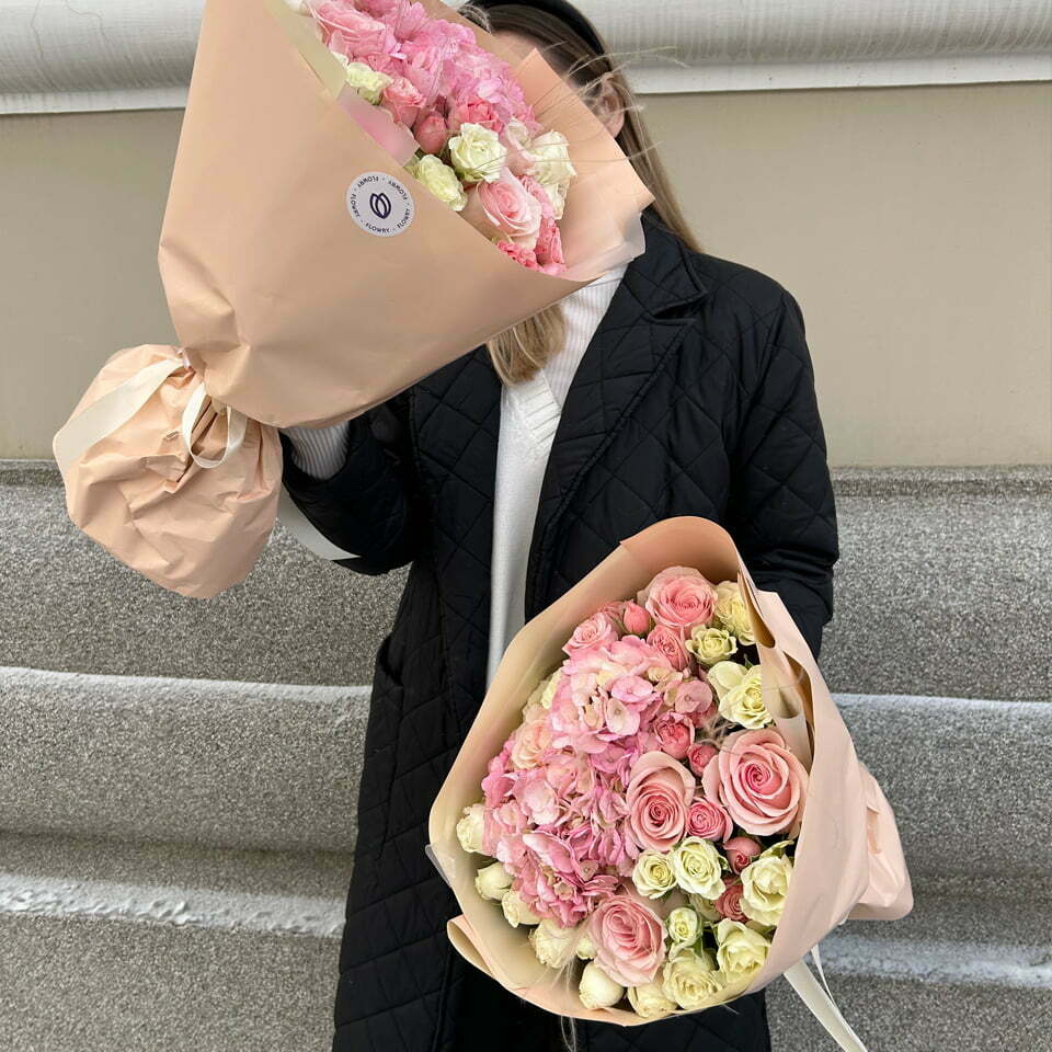 Сборный букет в нежный тонах с прекрасной гортензией, кустовыми розами и премиум розами Эквадор