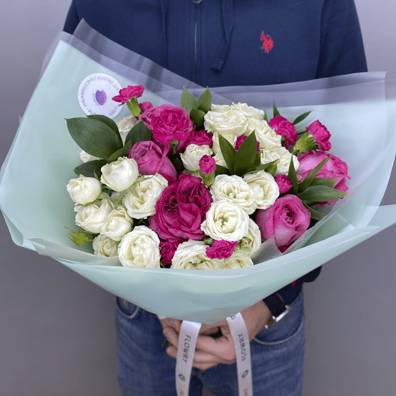 Роза кустовая, Роза одноголовая Люпин, Гвоздика кустовая, Рускус, Лента атласная фирменная, Пленка корейская